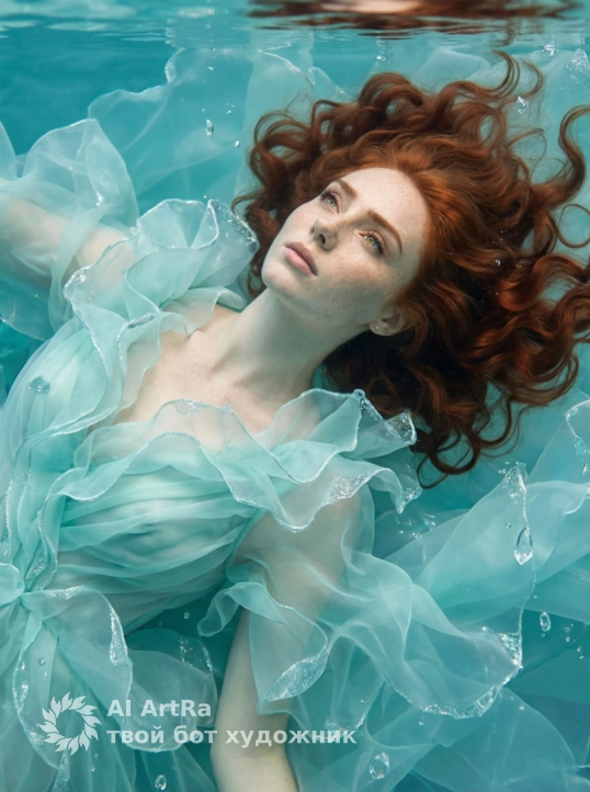 Создай не меняя черты лица • Сцена и настроение: эфемерная «ледяная русалка/королева моря», спокойная, магическая атмосфера, мерцающие блики и кристаллические капли вокруг модели.позирование: модель лежит на спине в прозрачной бирюзовой воде, голова слегка откинута назад, плечи расслаблены, одна ключица и часть плеча открыты, руки не видны или аккуратно скрыты в складках платья; волосы распущены и свободно плавают в воде, образуя тёмные волны вокруг головы. • Одежда и текстуры: воздушное многослойное платье пастельно-аквамаринового цвета из лёгкой органзы/шифона с крупными рюшами и лепестками, слегка просвечивающее в воде, с блестящими краями; ткань должна создавать объёмные волнообразные формы вокруг корпуса.• Украшения: массивный воротник/ожерелье из крупных жемчужин, жемчужная корона/диадема с кластерами жемчуга и маленькими кристаллами, дополнительные жемчужные акценты на плече и в волосах — все элементы с мягким перламутровым блеском. • Макияж: влажный, сияющий макияж в морской палитре — идеальная сияющая кожа с перламутровым хайлайтером на скулах и ключицах; глаза — мягкие оттенки аквамарина и серебра, лёгкий шиммер по подвижному веку, длинные объёмные ресницы; брови аккуратно оформлены; губы — нейтральный бежево-розовый или нюд с глянцевым перламутровым финишем. • Волосы: длинные волны, свободно распущены, слегка влажный эффект, декорированы маленькими жемчужинами и каплями воды. • Окружение и реквизит: прозрачные «ледяные» кристаллы/кумулюсы и крупные капли воды, плавающие вокруг; поверхность воды бирюзово-голубая с мягкими световыми разводами и искрами.• Свет и камера: мягкий рассеянный свет с контровым/обрамляющим (rim) подсветом для подчёркивания влажного блеска и жемчужного сияния; источник сверху и сзади, лёгкие бликовые акценты на каплях и жемчугах; камера сверху — средний план от груди до головы, небольшое сужение глубины резкости (aperture f/2.8–f/4), фокус на жемчугах и верхней части туалета, фон слегка размыт.• Постобработка: усиление перламутрового свечения, подчёркнутые блики на воде и жемчуге, мягкое свечение кожи, высокая детализация текстур ткани и капель, лёгкая цветокоррекция в сторону бирюзово-голубой гаммы, тонкая зернистость для кинематографичности.