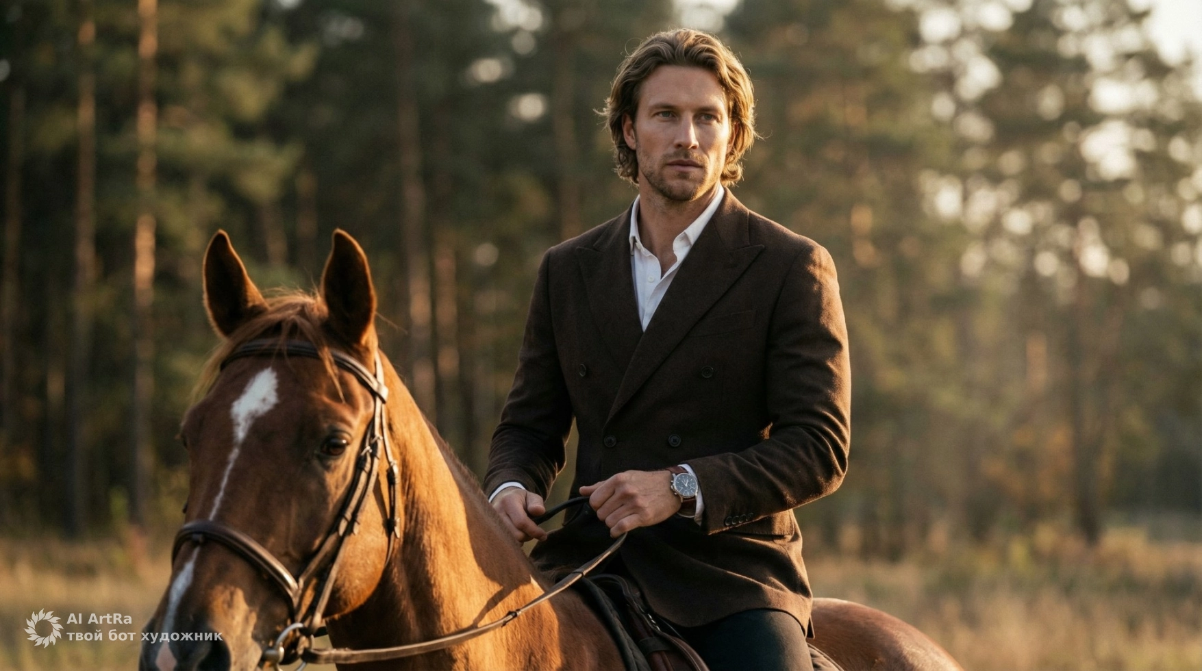 Представьте себе, как вы, облачённые в элегантный костюм, сидите на величественном коне, окружённом зелеными соснами и мягким светом золотого часа. С ARTRA вы можете создать эту атмосферу и запечатлеть ваш стильный образ в уникальном кадре, отражающем вашу личность и эстетические предпочтения.