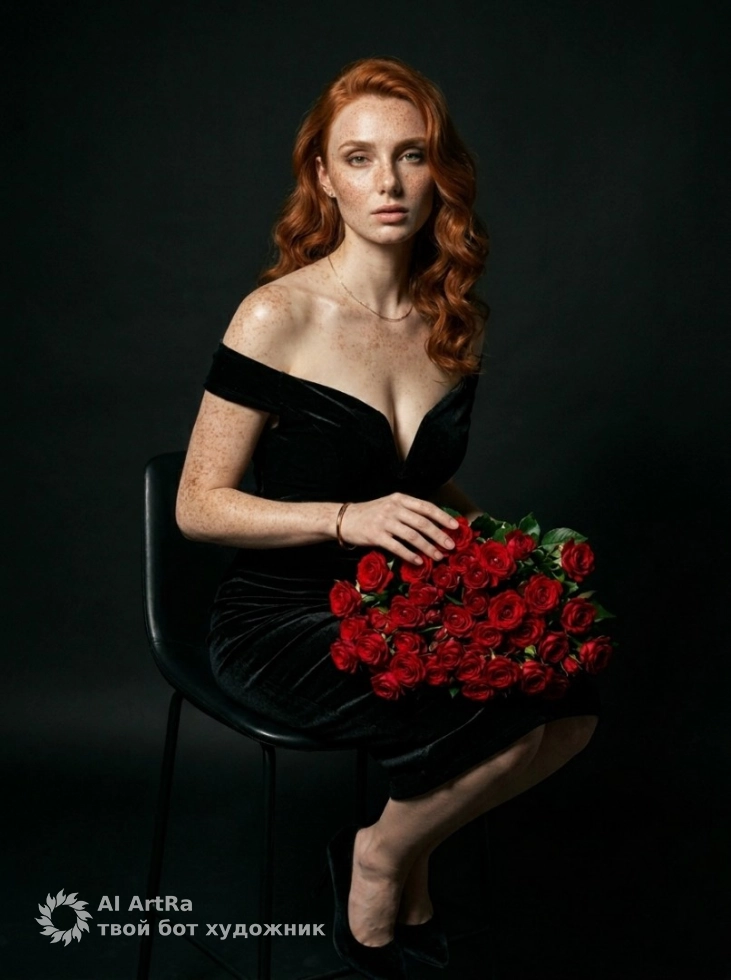 На арт фотосессии вы сможете запечатлеть уверенный и загадочный взгляд в окружении прекрасных красных роз. Сочетание черного бархатного платья в сочетании с минималистичными украшениями и вечерней укладкой создаст атмосферу утонченной элегантности.