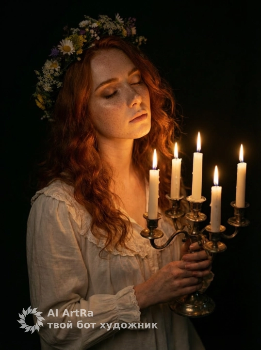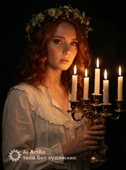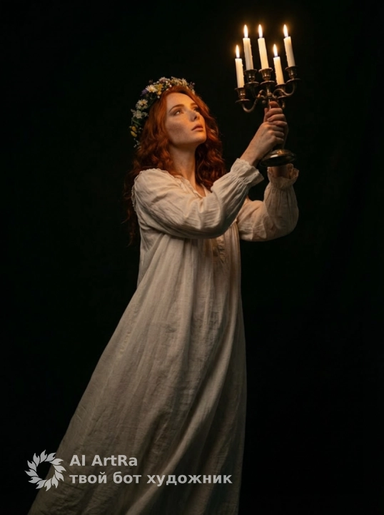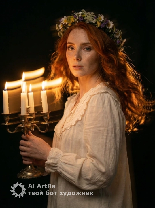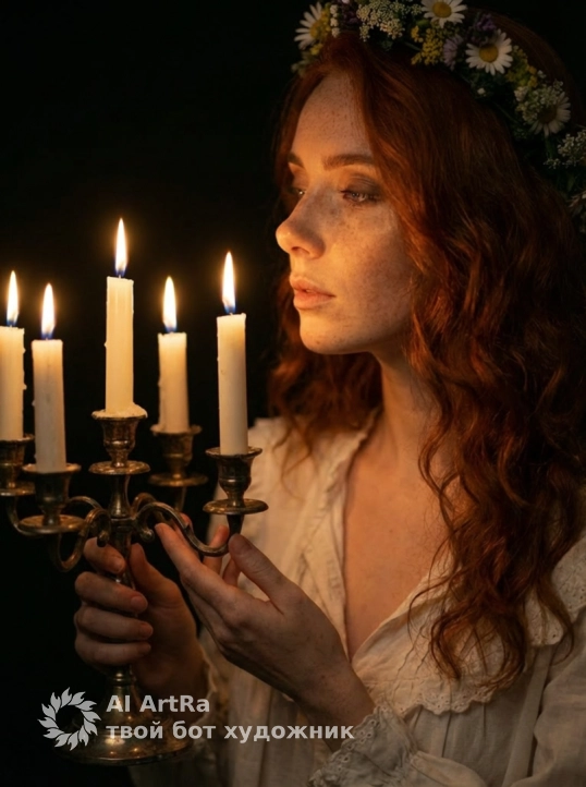 Низкоосвещённый портрет: стройная девушка, не меняй черты лица в белой воздушной ночной рубашке с рюшами и венком из полевых цветов на голове, держащая старинный канделябр с пятью тонкими зажжёнными свечами. Тёплый свечной свет, драматический контраст, глубокие тени, мягкое боковое и контрсветовое подсвечивание волос и плеч, мелкие детали — восковые потёки на свечах, отражения на металлическом канделябре, текстура хлопка, тонкая игра света на коже и тканях. Атмосфера таинственная, интимная, кинематографичная. Фотореалистично, высокое разрешение, детальная текстура, shallow depth of field, сильное боке, 50mm, f/1.8, cinematic color grading (тёплые янтарные тона и глубокие чёрные), лёгкая зернистость пленки.Негативный промпт: "нет современного реквизита, без дневного света, без надписей, без ярких неоновых цветов. сохрани черты лица.