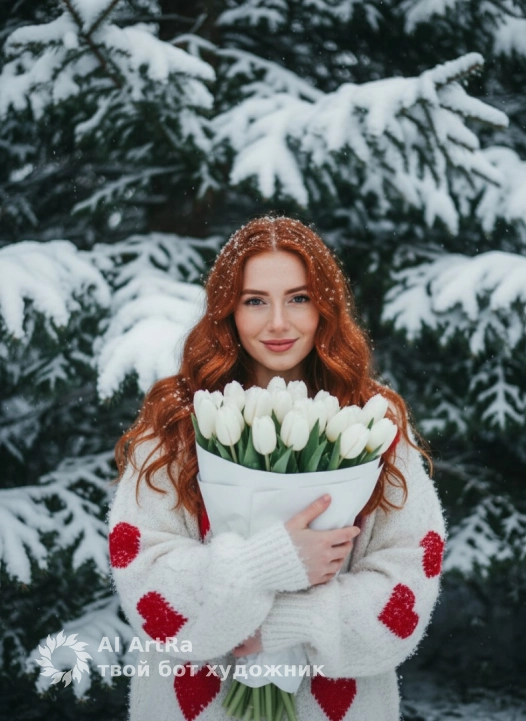 Привлекательная зимняя портретная фотография в стиле модной 35-миллиметровой пленки, сохраняйте свою внешность, девушка с длинными волнистыми волосами смотрит в камеру, с опущенными глазами, легкой улыбкой, розовыми губами. Белый пушистый свитер с маленькими косами с красными сердечками, рукава падают на кисти. На руках - большой букет белых тюльпанов, завернутый в бумагу, прижатый к груди. Волосы и свитер, ферментированные свежим снегом. Фон - толстый, покрытый снегом, темно-зеленый, с объемной текстурой, толстые, плотно покрытые снегом, еловые ветви покрыты снегом, как в сказочном лесу. Прозрачный: мягкий диффузный дневной, теплый на коже, легкое свечение от снега, без теней. Цвета: чистый белый + ярко-красный + насыщенный темно-зеленый + серебристый, контрастный, но мягкий. Настроение: теплое, любящее, удобное 50 мм, f/1.8, ISO 200, гладкое боке, букет, резкое внимание к текстуре лица и свитера, фон - мягкое боке, но с чистой текстурой снега и иглы. Как Kodak Portra 400 с естественной насыщенностью.