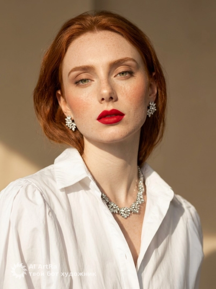 Представьте: вы находитесь в уютной обстановке, где мягкий свет создает интимную атмосферу, а ваши лучшие черты идеально освещены. Красная помада подчеркивает ваши губы, а стильное украшение добавляет элегантность. Ваши глаза выражают уверенность и живость, а поза раскрывает ваше внутреннее спокойствие и харизму. Это не просто фотография — это ваш личный бьюти рост, ваша эстетика.