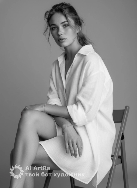 Base Image: студийный чёрно-белый портрет девушки, сидящей на складном стуле. Она слегка откинута назад, корпус развёрнут в три четверти к камере. Левая рука свободно лежит на колене, правая опирается на подлокотник стула, пальцы расслаблены. Ноги скрещены, создавая плавную диагональ в композиции. Голова чуть наклонена вперёд, взгляд направлен прямо в камеру, выражение уверенное, нейтральное. Освещение мягкое, фронтально-боковое, подчёркивающее структуру лица и складки одежды. Девушка одета в свободную белую рубашку-тунику из лёгкой ткани, длиной выше колена, с широким воротом и подвернутыми рукавами до локтей. На руках — тонкие украшения: кольца и браслеты, добавляющие акцент, но не отвлекающие внимание. Фон ровный серый, без текстур или деталей, создающий чистый минималистичный студийный стиль. Задача — заменить лицо на лицо из Source Image, сохранив все вышеописанные позу, освещение, одежду, украшения и общее настроение кадра. Интеграция лица должна быть полностью естественной, без швов и артефактов, с точным совпадением тонов, теней и контраста.