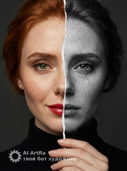 Постобработка: Высококачественная ретушь, сохраняющая естественную анатомию лица, но подчеркивающая концептуальный разрыв. Переход между цветной и ч/б зоной выполнен через текстуру рваной белой бумаги с мелкими ворсинками на краях.