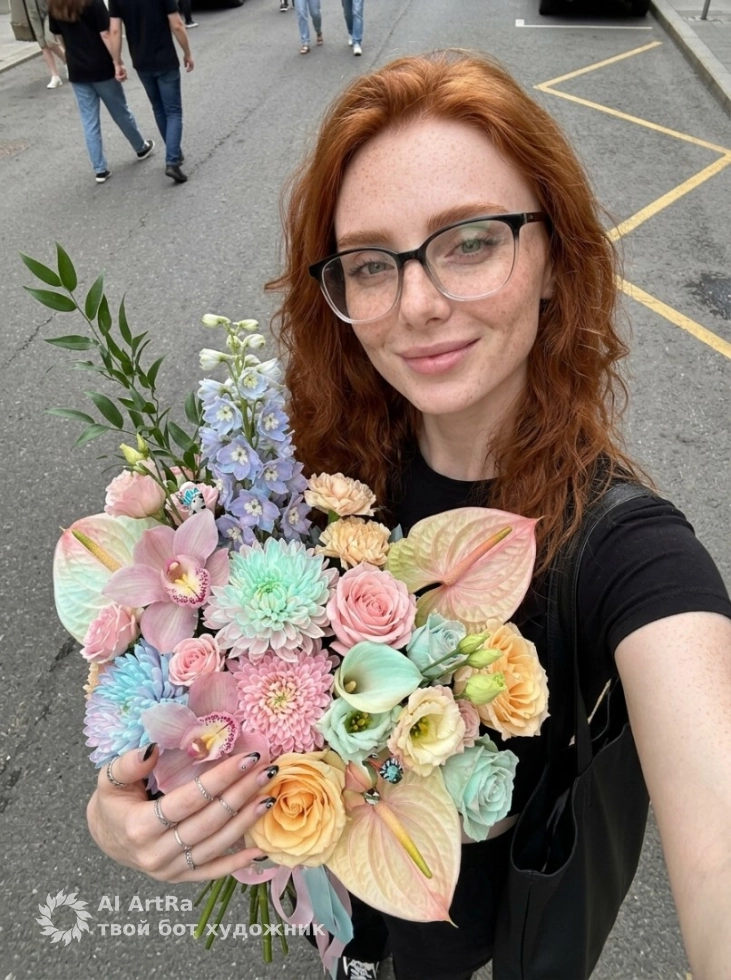 Вдохновляйтесь своей креативностью и создавайте уникальные фотосессии с помощью нашего сервиса ARTRA! Представьте себе эффектный кадр, где вы стоите в городской среде с большим букетом прекрасных цветов. Наша технологическая платформа позволяет вам воссоздать подобные образы, делая ваш контент в соцсетях еще более привлекательным и профессиональным.