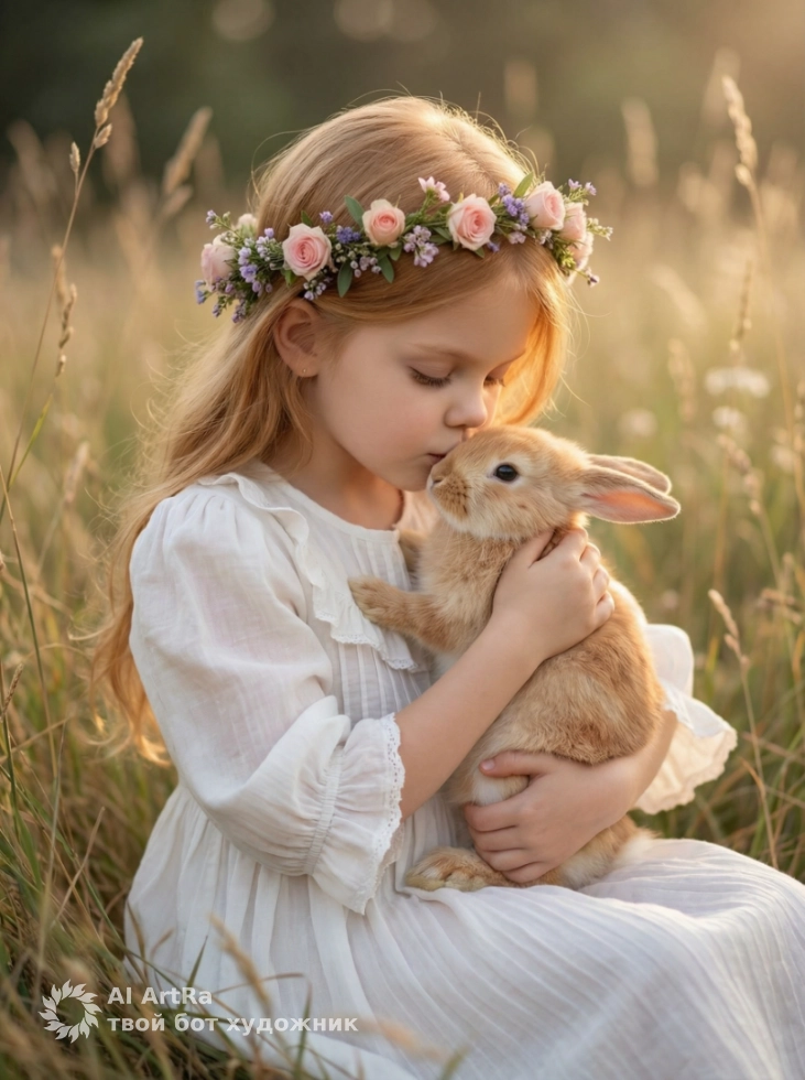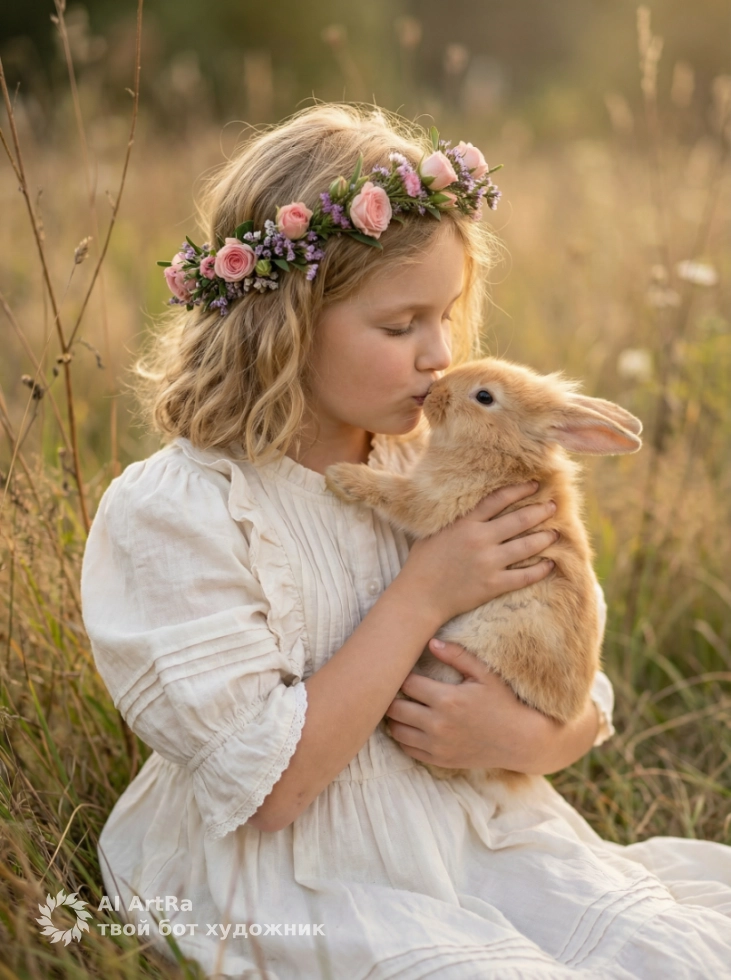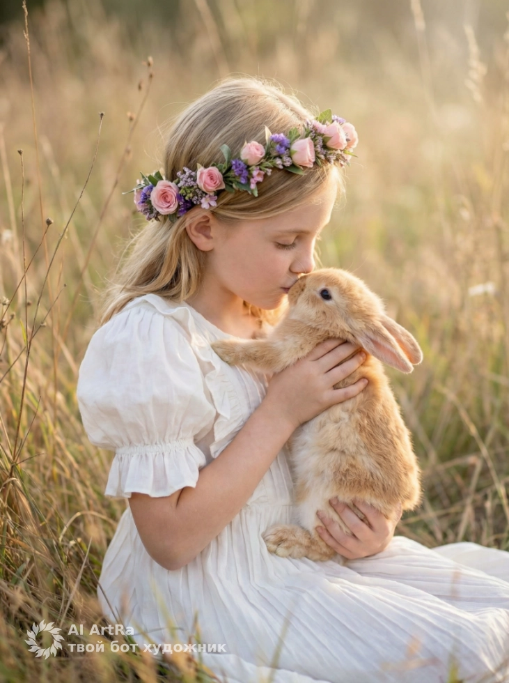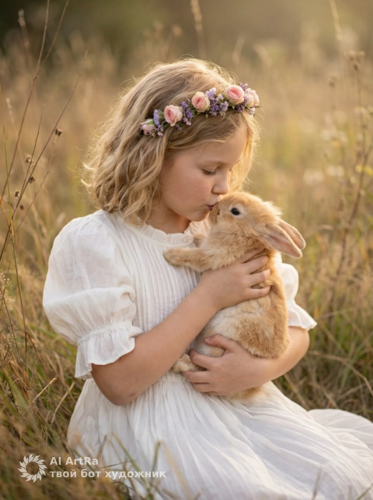 Девочка и рыжий кролик на закате