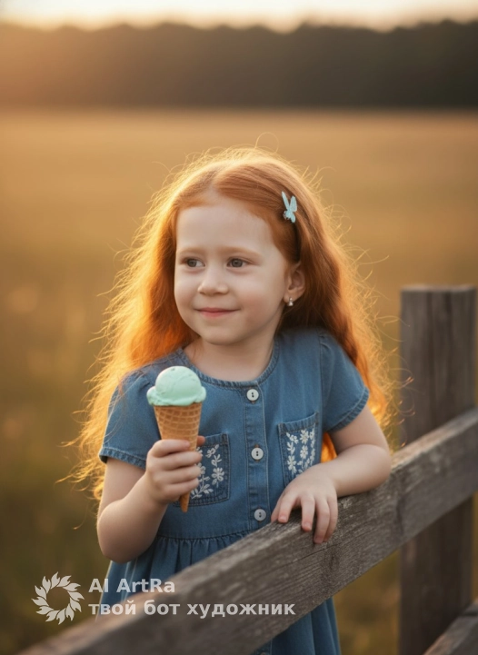 Цветовая гамма: Снимок построен на красивом контрасте теплых оттенков (рыжие волосы, дерево, закатное поле) и холодных акцентов (голубое платье, мятное мороженое, заколка).Use the user's appearance 1:1 — face, skin, hair and body without any changes.