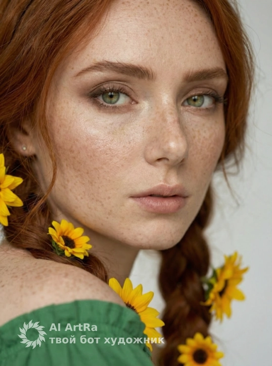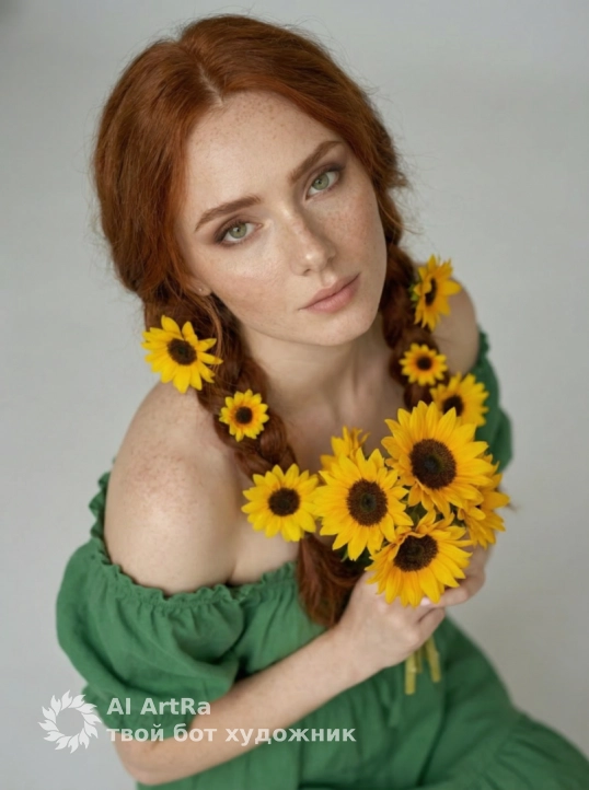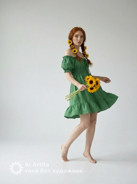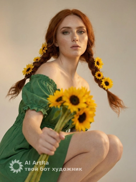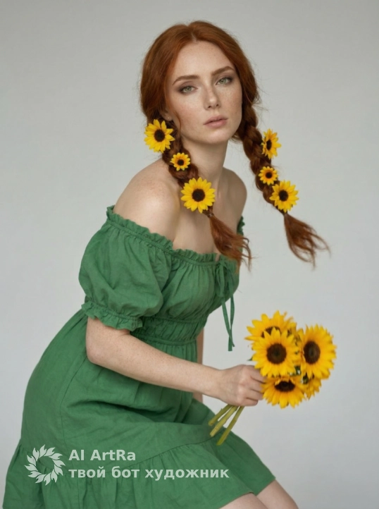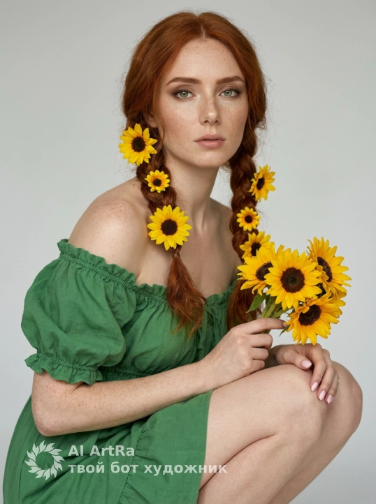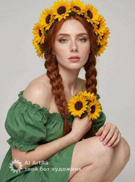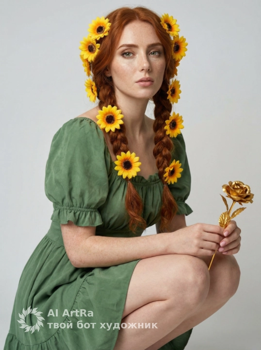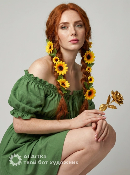 Используйте внешний вид пользователя, референса 1:1 — лицо, кожу, волосы и тело без каких-либо изменений. На голове — венок из ярких желтых солнцецветов, аккуратно вплетенных в две длинные, плотные косы, спадающие по плечам; макияж нежный, с акцентом на розовые губы и подчеркнутыми бровями, взгляд прямой, спокойный и немного задумчивый; на пальцах — короткий, естественный маникюр с розовым оттенком; одежда — зеленое платье с пышными рукавами-фонариками, открытыми плечами и воланами, юбка длиной до середины бедра, ткань мягкая, с легкими складками; в правой руке — маленький букетик подсолнухов, левая рука лежит на колене; поза — сидя на корточках, колени согнуты, корпус слегка наклонен вперед, взгляд направлен прямо в камеру; фон — однотонный светло-серый, студийный, без деталей; освещение мягкое, рассеянное, с легким боковым светом, подчеркивающим объем и текстуру ткани; стиль — гиперреалистичная цифровая фотография с элементами художественной постановки; композиция — центральный план, средний план, объект занимает большую часть кадра, ракурс — на уровне глаз; атмосфера — нежная, мечтательная, с легкой сказочной нотой, эмоции — спокойствие, умиротворение и легкая игривость.