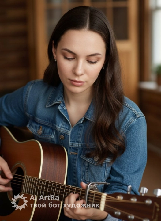 Create a hyper-realistic portrait of a beautiful young woman with flawless skin, using the original face from the attached reference photo. The woman has slightly wavy brown hair. This close-up/half-body shot focuses on her face as she plays an acoustic guitar. The subject is a young adult Asian woman with a beautiful face, long dark brown/light brown hair that looks healthy. She is wearing a blue denim jacket. The action: The woman is leaning slightly forward, looking down, and playing the guitar with one hand, with a dark brown guitar featuring a capo (Capo) on the chords.
