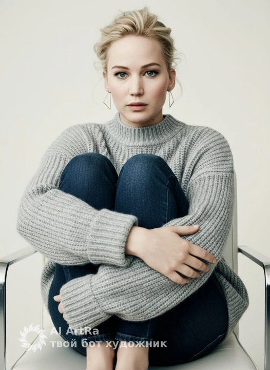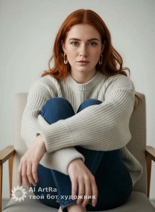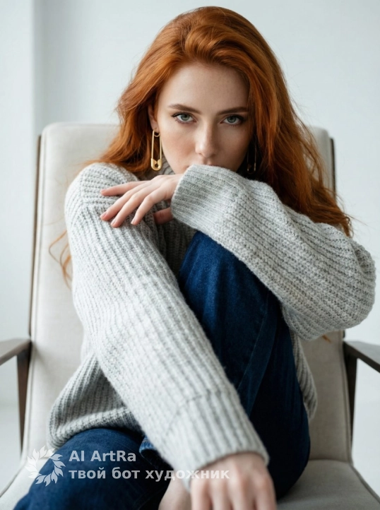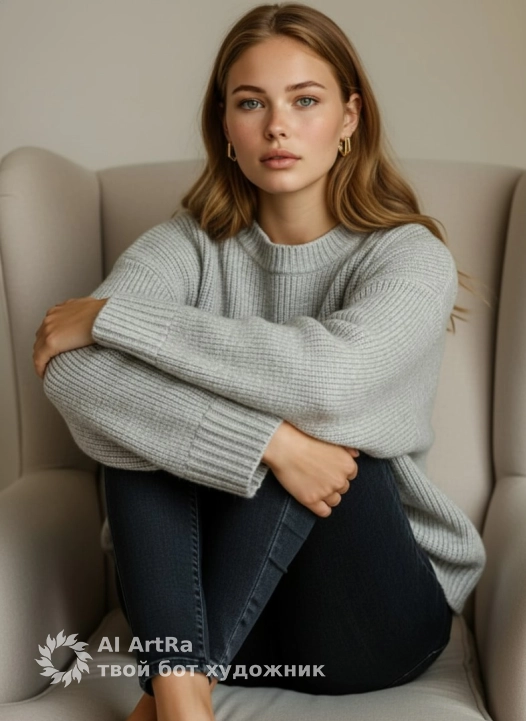 Создай портрет не меняя черты лица. Крупный план женщины с длинными волосами, сидящей в кресле, ноги закинуты на кресло, руки лежат на коленях и вытянуты к камере. Женщина смотрит прямо в камеру с проницательным выражением. Она одета в большой, ребристый, светло-серый вязаный свитер, Её руки, скрещены и закрывают часть её лица и тела. На ней тёмные, джинсы На ушах , геометрические золотые серьги в виде булавок. Фон минималистичный, светлый. Мягкое студийное освещение, высокая детализация, реалистичная фотография, модный журнал, портрет.