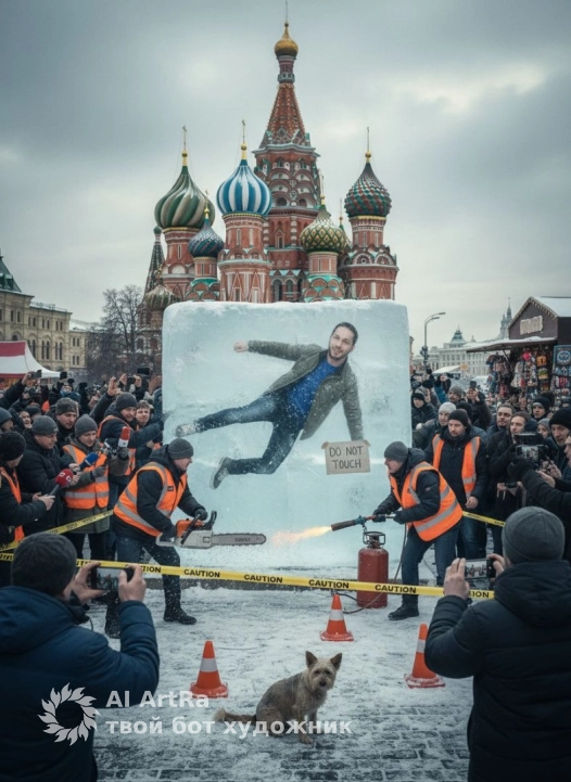 Hyperrealistic, full body shot of a person, completely encased inside a massive, frosted ice cube with a matte, slightly opaque surface covered in snow. The person's face and clothing are perfectly recreated from the uploaded reference photo, with maximum facial accuracy and identical attire, visible inside the ice with minimal distortion. The person is frozen in a dynamic, mid-action pose: (tripping over an invisible obstacle, legs kicked up or spinning from a failed attempt at ice skating or lunging forward to catch a slipping hat or recoiling in surprise from a splash of melted ice). A chaotic and absurd rescue operation is in full swing: emergency workers or bewildered passersby are desperately trying to free them using a roaring chainsaw or a large propane torch or even pouring hot tea from a thermos. The scene is cordoned off with yellow "Caution" tape. A crowd of reporters and bloggers with microphones and cameras is surrounding the ice cube. The frozen person has a hilariously (confused or shocked or blissfully unaware) expression. Scene set unmistakably in Russia: (a snowy square with St. Basil's Cathedral in the background or a typical panelny district courtyard with old Ladas or the frozen surface of a lake in a city park). Ironic details: (a stray dog watching curiously or a babushka offering a blanket or a "Do Not Touch" sign taped to the ice or a tourist buying a magnet from a nearby stall). The ice cube and the person inside are life-sized, in correct human scale relative to the rescuers. A medium distance shot that shows the full ice cube and the surrounding crowd in accurate perspective. Cinematic, dramatic lighting, photorealistic details, 8K, trending on ArtStation, aspect ratio 9:16.