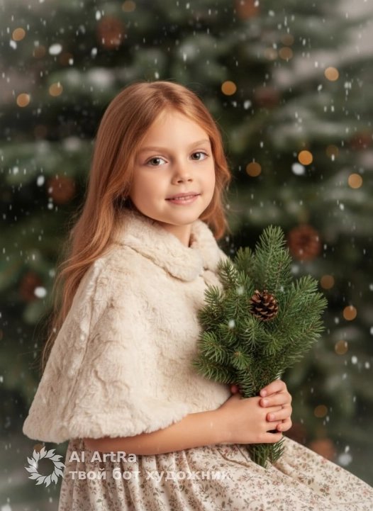Используйте внешний вид пользователя, референса 1:1 — лицо, кожу, волосы и тело без каких-либо изменений, с естественным, нежным макияжем, подчеркивающим свежесть и мягкость черт: легкий румянец на щеках, едва заметный блеск на губах, акцент на чистоте и сиянии кожи, без теней или подводки; маникюр и педикюр — натуральные, ухоженные ногти без лака, с аккуратной формой; украшения — минималистичные, возможно, небольшие сережки-гвоздики; главный объект — ребенок, сидящий в полупрофиль, держащий в руках букет из свежих еловых веток и шишек, взгляд направлен прямо в камеру с теплой, искренней улыбкой; художественный стиль — высокодетализированная цифровая фотография с элементами сказочной магии, мягкий фильтр, создающий ощущение зимней сказки; фон — размытая еловая роща с падающим снегом, ветки и шишки в глубине кадра; освещение — мягкое, рассеянное, с теплым боке, создающее атмосферу уюта и волшебства, цветовая палитра — приглушенные зеленые, кремовые, коричневые и белые оттенки; камера — средний план, ракурс немного снизу, композиция центрирована, с акцентом на руки и букет; объект расположен в центре кадра, слегка наклонившись вперед; масштаб — средний план, от пояса вверх; атмосфера — праздничная, нежная, сказочная, наполненная детской радостью и зимним волшебством; одежда — длинное платье с мелким цветочным принтом, поверх — меховая накидка с естественной текстурой; поза — сидя, спина прямая, руки аккуратно сцеплены перед собой, держа букет, плечи расслаблены, выражение лица — спокойное, счастливое, с легким намеком на загадку.