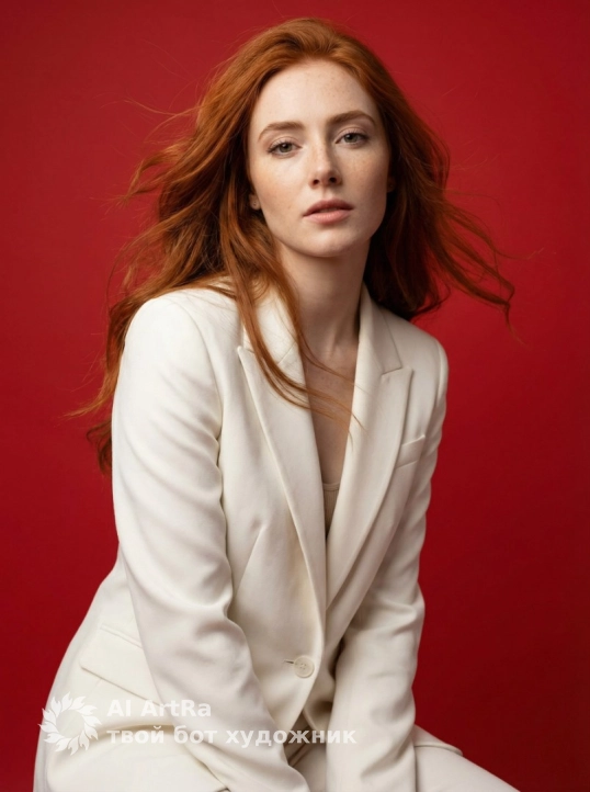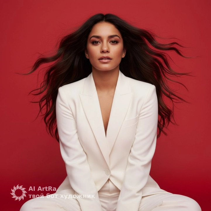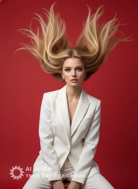 черты лица и волосы полностью должны сохраниться minimalist studio fashion portrait on a solid saturated red seamless. Woman centered, seated, leaning slightly forward, direct gaze; long hair blown by wind. Structured white/ ivory single-button blazer. Soft front-left key light, gentle shadows, clean skin tones, bold red-white color blocking. Negative: harsh on-camera flash, clutter, color spill, blown whites, wide-angle distortion.