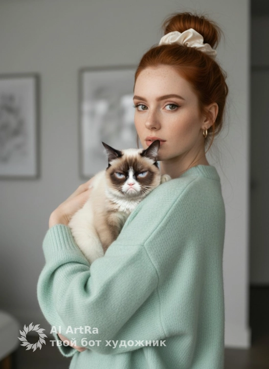 The lighting is soft and natural. Diffused daylight comes from the front and slightly to the left, evenly illuminating the woman's face and the animal's fur. The shadows are soft, low-contrast, barely noticeable under the chin and along the arms. The light highlights the texture of the skin and fur. The atmosphere is calm and homely.