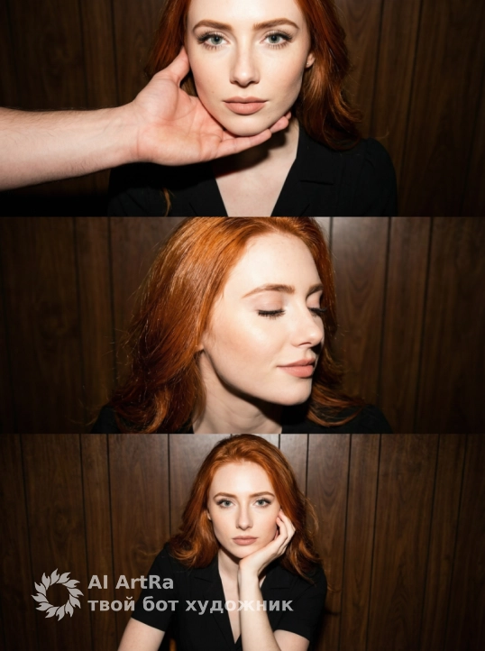 A three-panel triptych featuring a woman and a man's hand. Each panel shows a different pose and facial expression against a simple, neutral background. The top panel is a close-up of the woman's face and upper chest. She looks directly at the camera, her head slightly tilted. A man is off-screen, only his hand visible. The man's large hand cups the woman's cheek and jaw on either side. The woman's eyes are open and look directly into the lens. The camera is shooting from a top-down angle. The middle panel is a close-up. The woman's face is slightly turned three-quarters to the camera. Her eyes are closed. Her mouth is relaxed, a barely perceptible smile. The camera is at eye level. The bottom panel is a medium shot from the head to the middle of her torso. The woman sits, resting her chin on the man's hand. She looks directly at the camera with a neutral, calm expression. The shot is from a top-down angle. All three panels feature natural makeup with an emphasis on the eyes, even skin tone with a soft matte finish, upper lashes extended and separated with black mascara, and lips with an even coat of beige-pink lipstick. Hair gleams from the flash. The woman wears a black dress with a V-neck and collar, with long sleeves. The man's arm in the top panel is bare, with light skin tones, part of the forearm visible. The setting for all three panels is an indoor room with flat, dark wood paneling as a background. The wood grain is visible as vertical or horizontal planks in a medium to dark brown shade. The background is out of focus and identical in all three panels to emphasize consistency. Lighting in all three panels: bright direct flash, hard on-camera front lighting positioned close to the lens axis, strong front lighting evenly illuminating the face and upper body, short, sharp shadows under the chin and slightly behind the woman on the wall, high contrast with clear specular highlights on the skin and hair, pronounced flash catchlights in the pupils, minimal background fill. Highly detailed photorealistic, shot on a 35mm lens for all three panels, shallow depth of field with sharp focus on the woman's face, hand, and upper body, slightly blurred wooden background with soft but noticeable texture, photographic style reminiscent of straight digital flash photography for social media.