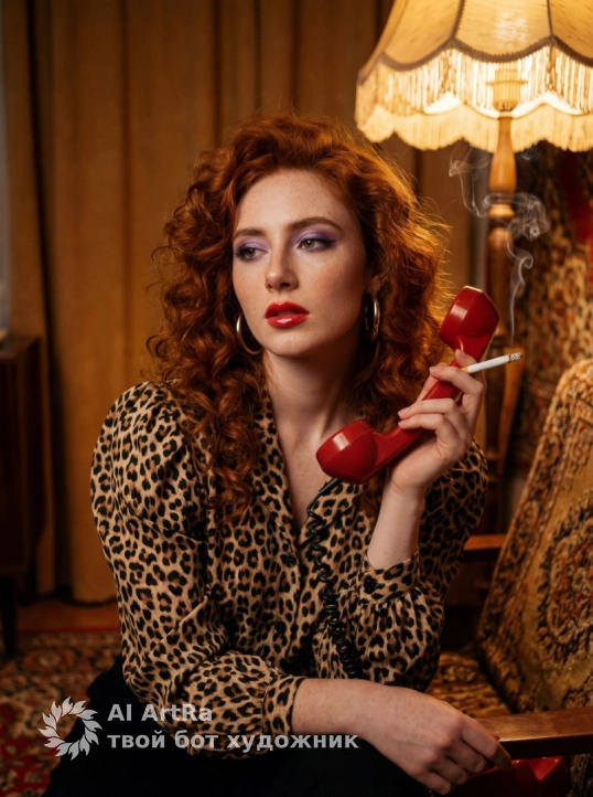 Retro portrait in 1980s fashion, use the woman’s original appearance 1:1 — face, skin, hair, body unchanged, voluminous curly hair, purple eyeshadow, glossy lips, cinematic lighting, nostalgic tone. A vintage woman sits in a Soviet-style bohemian apartment with an oriental carpet, fringe lamp and warm golden-brown palette. She wears a leopard print blouse with puffed sleeves, gold earrings. In one hand a red retro telephone receiver, in the other — a cigarette with rising smoke. Intimate atmosphere, film-noir softness, textured fabrics, soft shadows, melancholic glamour, artistic high-detail photography.