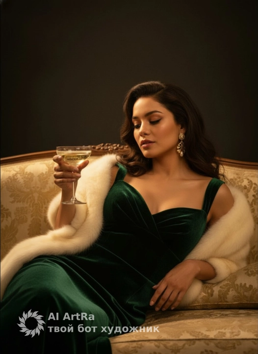 She wears a luxurious deep-green velvet evening gown with a sweetheart neckline — the velvet richly textured, forming natural folds and soft highlights as it drapes over her body. Draped around her shoulders is a plush cream fur stole, its fibers softly illuminated by golden light, adding warmth and vintage sensuality.