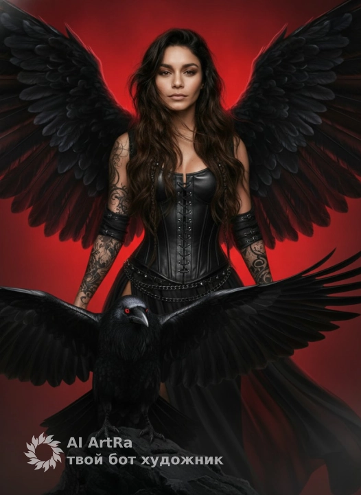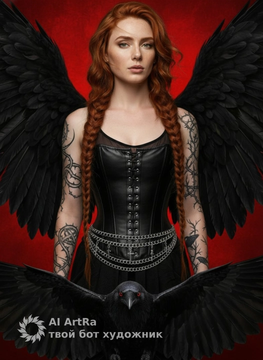 The image is a dramatic fantasy-style portrait featuring a beautiful female warrior. She has fair skin and her arms are decorated with intricate tattoos. Her hair is braided in long braids, and she wears a black lace-up corset with a chain belt, giving her a Gothic look. Wings with black feathers extend behind her back, adding a mystical theme. In the foreground is a large black raven with piercing red eyes, wings spread wide. The background is made in bright red, which enhances the tense. Use the user's appearance 1:1 — face, skin, hair and body without any changes.