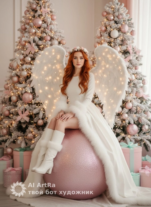 Используйте внешний вид пользователя, референса 1:1 — лицо, кожу, волосы и тело без каких-либо изменений. На изображении — ангельская фигура с огромными пушистыми белыми крыльями, украшенными мерцающими огнями, сидящая на гигантском розовом блестящем рождественском шаре, обрамлённая двумя снежными ёлками с розовыми и белыми шарами, мигающими гирляндами и подарочными коробками в пастельных тонах; на голове — венок из нежных цветов, на теле — облегающее белое платье с пышными меховыми манжетами и подолом, на ногах — высокие белые зимние ботинки с меховой отделкой; макияж — сияющий, с розовыми румянами, акцентом на глазах с мерцающими тенями и длинными ресницами, губы нежно-розовые с глянцевым блеском; ногти — короткие, аккуратные, с белым лаком; композиция — центральный ракурс, средний план, камера на уровне глаз, мягкий рассеянный свет с боковым подсвечиванием от окон и гирлянд, создающий волшебную, праздничную, сказочную атмосферу с ощущением тепла и волшебства; стиль — фотореализм, высокая детализация, глубокая глубина резкости, нежные пастельные тона с акцентом на розово-белой гамме, фон слегка размыт для акцента на фигуре.