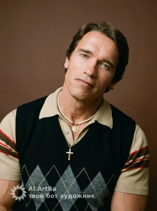 Portrait of a man tilting his head to the left and looking at the camera, medium shot, eye-level angle, man wearing a beige polo shirt with brown and red stripes on the sleeves, a black knitted vest with gray diamonds, a gold chain with a cross, and a pearl necklace with a gold medallion. Location: studio with a plain brown background, soft frontal light, soft shadows, retro and relaxed atmosphere, shot with an 85mm lens with a shallow depth of field, photorealistic photography style, color palette with a predominance of beige, black, gold, and warm skin tones, highly detailed, photorealistic. Shot on a film camera.