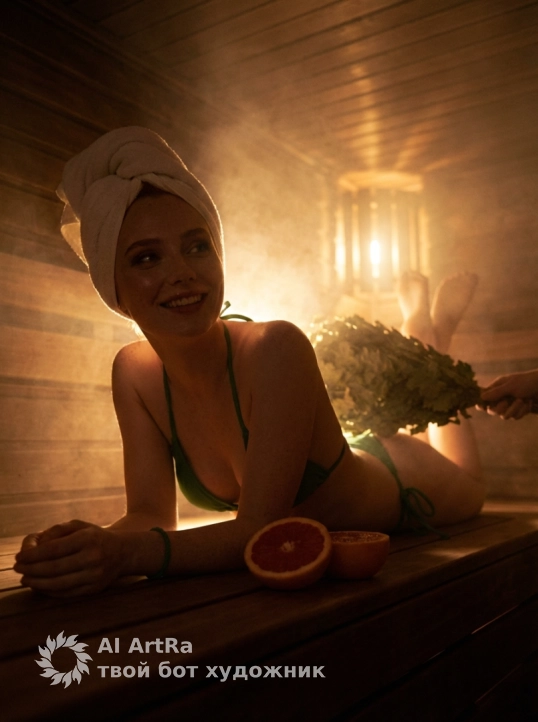 Используйте внешний вид пользователя, референса 1:1 — лицо, кожу, волосы и тело без каких-либо изменений. Женщина в расслабленной позе лежит на деревянной скамье в тёплой, уютной бане с тёмными деревянными стенами и потолком, голова обёрнута мягким белым полотенцем, на лице — естественный, свежий макияж с акцентом на сияющие щёки и ухоженные губы, ногти на руках и ногах аккуратно подстрижены, без лака, на запястье — тонкий зелёный браслет, рядом с руками — два половинки грейпфрута с сочной мякотью, в ногах — веник из свежих зелёных листьев, который кто-то держит в руке, создавая ощущение ритуала парения, одежда — зелёный бикини с тонкими бретельками, поза — лёжа на животе, голова повернута в сторону камеры с широкой искренней улыбкой, взгляд направлен вверх и в сторону, камера снята с низкого ракурса, чуть сбоку, в масштабе среднего плана, освещение тёплое, мягкое, с лёгким боке на заднем плане, цветовая палитра — насыщенные зелёные, тёплые коричневые и оранжевые оттенки, атмосфера — расслабленная, радостная, оздоровительная, художественный стиль — реалистичная фотография с мягким фильтром, передающим текстуру дерева, кожи и ткани.