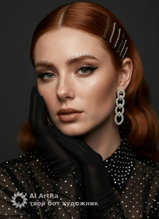 • Одежда: На девушке черная полупрозрачная блуза в мелкий блестящий горошек (стразы), на руках — высокие черные перчатки, которые она поднесла к лицу, создавая элегантную позу.