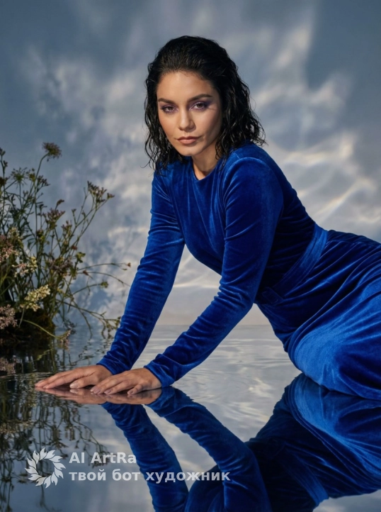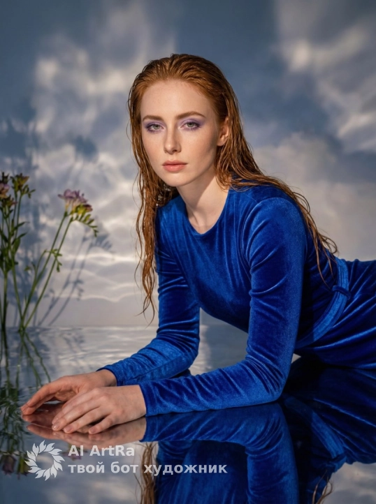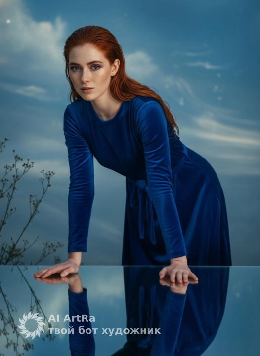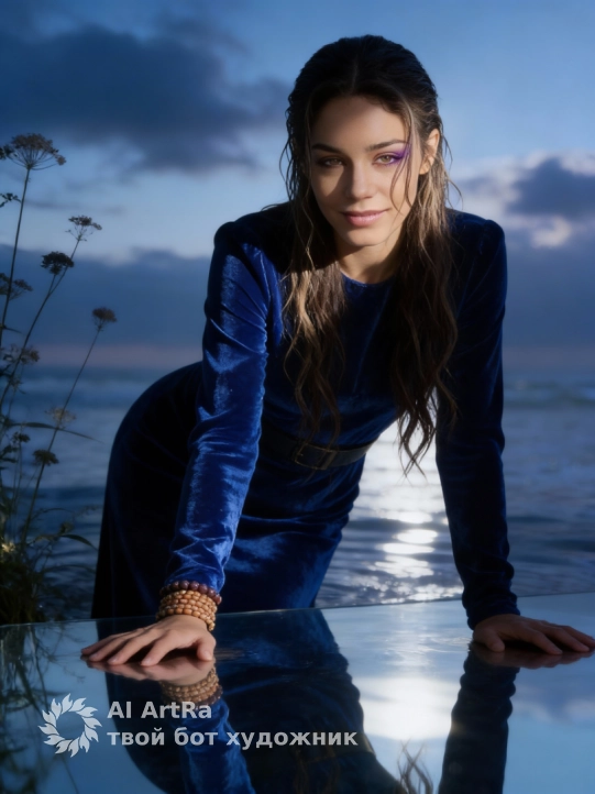 Не меняя внешности женщины с фото, сцена с загадочной атмосферой и насыщенной цветовой палитрой, ведущий оттенок кобальтового синего в бархатистом платье с длинными рукавами и поясом, подчёркивающим фигуру и изящество позы. Женщина опирается на обе руки на гладкую отражающую поверхность, создавая эффект продолжения рук в зеркальной воде, тело наклонено вперед, взгляд прямо в объектив с уверенностью и внутренней силой. Влажные светлые волосы зачесаны назад, локоны текут по плечам, добавляя чувственности и лёгкий диссонанс с тканью. Макияж с лёгким фиолетовым оттенком теней подчёркивает выразительность глаз, фоне с размытыми облаками и световыми бликами создаёт иллюзию движения воды и воздуха. Слева растения с тонкими стеблями и соцветиями частично затенены, добавляя живую текстуру и контраст с поверхностью и тканью. Свет сбоку выделяет рельеф ткани и очерчивает лицо и руки, придавая глубину и объём, умеренные тени подчёркивают контуры и создают атмосферу утренней или вечерней тишины. Настроение кадра — загадочность и спокойная сила, подчёркивающая красоту и стойкость женщины в мистической обстановке, фотореалистичное изображение, высокая детализация, 4K.