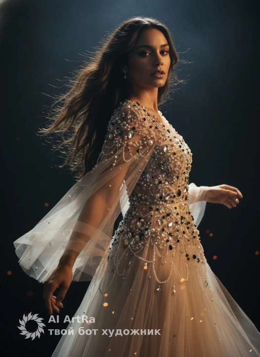Одежда: на мне воздушное вечернее платье из лёгкого фатина/органзы с летящими рукавами. цвет платья кремово-бежевый, основной оттенок близок к #F3E2D2, полупрозрачная многослойная ткань красиво ловит свет. вся верхняя часть платья и рукава богато украшены нитями с бусинами, кристаллами и жемчугом, а также плотной бисерной вышивкой — много чёрных и прозрачных кристаллов, перламутровых жемчужин, отдельные тёплые золотистые и красные искры, всё ярко мерцает и переливается в свету прожектора. рукава свободные и летящие, с движением ткани вокруг рук.