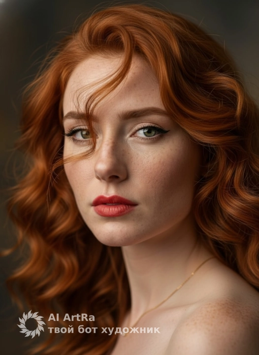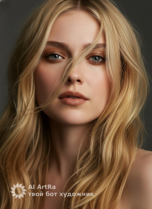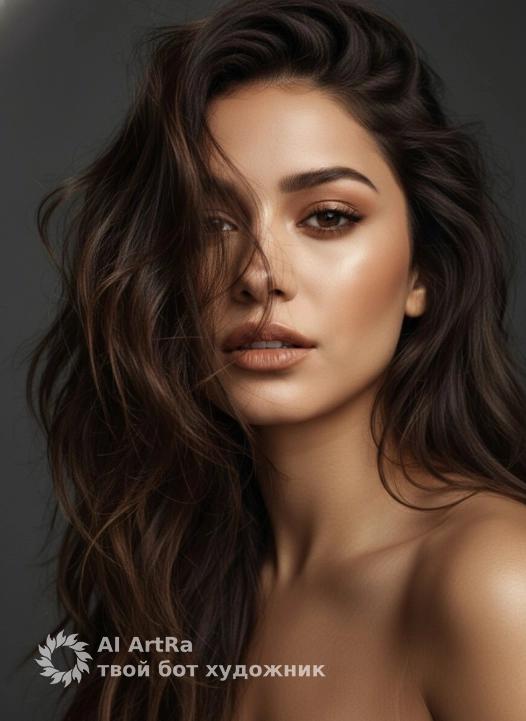 Her hair is voluminous and slightly wavy, as if it is swaying in a light wind. The strands partially cover the face, creating a dynamic, sensual and fashionable look. The hair texture is natural, detailed and realistic.
