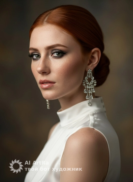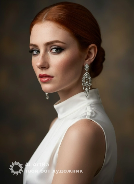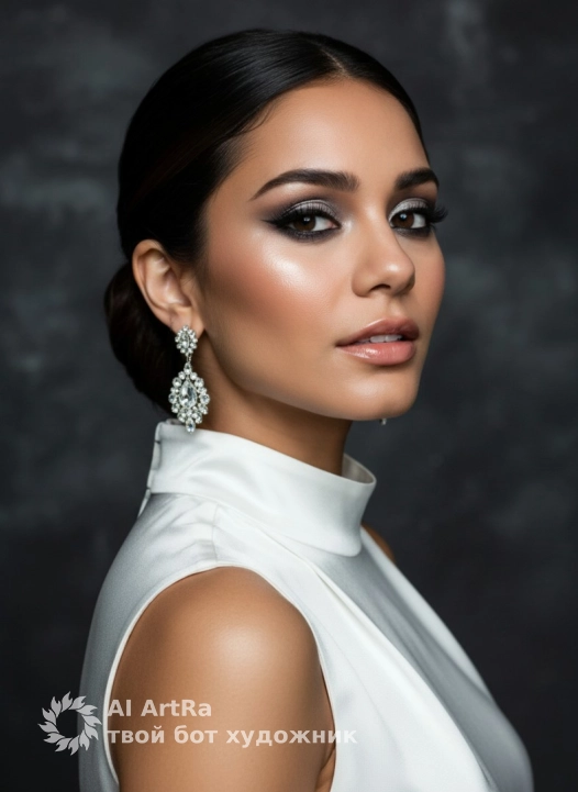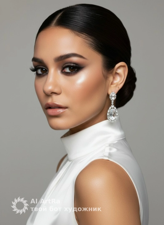 Гиперреалистичное изображение, экстримально близкий план, фокус на лице и верхней части тела модели, под углом 45 градусов, с акцентом на макияж и аксессуары. Модель смотрит прямо, выражение лица уверенное с легкой загадочностью. Голова слегка повернута в профиль, но взгляд полностью направлен в камеру. Тело повернуто в другую сторону, создавая динамичность и интересный ракурс. Dramatic chiaroscuro, harsh tonal contrast, clear facial contours, high skin brightness, deep study of fabric folds., подчеркивающее контуры лица и верхнюю часть тела, с акцентом на блеск на коже. Макияж: глаза с глубокими смоки айз и четкой подводкой, густые ресницы, удлиненные на внешнем уголке, металлические тени, создающие блики на веках. Брови натуральной формы, с четким контуром, приподнятые на внешнем углу. На скулах легкий румянец с влажным хайлайтером, придающим коже сияние. Губы покрыты прозрачным блеском, отражающим свет, создавая эффект объема. Прическа — низкий строгий пучок с зачесанными прядями, без выбившихся волосков. Одежда: белая атласная блуза с высоким воротом, без рукавов, облегающая шею и плечи, идеально подчеркивающая линию воротника и груди. Акцент на украшениях — крупные серебристые серьги с кристаллами, эффектно выделяющиеся на фоне макияжа и освещения.Use the user's appearance 1:1 — face, skin, hair and body without any changes.