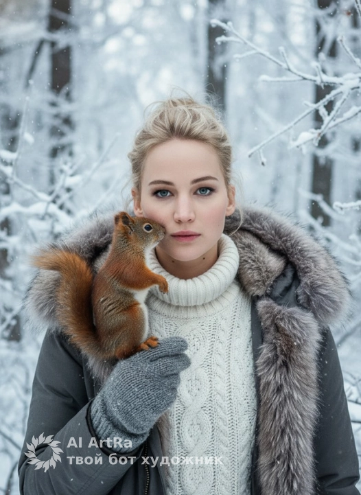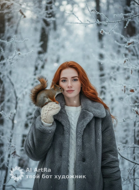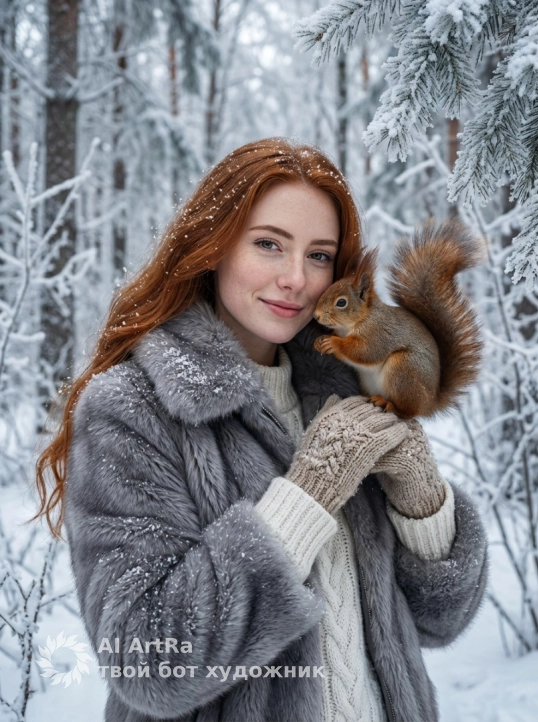 Используйте внешний вид пользователя, референса 1:1 — лицо, кожу, волосы и тело без каких-либо изменений. Женщина в зимнем лесу держит на перчатке пушистую белку, которая касается мордочкой её щеки; сцена передана в стиле гиперреалистичной фотографии с тонкой детализацией текстур: снежинки на ветвях, переливы меха куртки, вязаные узоры и свитера. Фон — зимний лес с обледенелыми деревьями, покрытыми инеем, мягкий рассеянный дневной свет создает атмосферу спокойствия и гармонии с природой, холодные оттенки серого и белого контрастируют с теплыми акцентами на мехе белки. Композиция — средний план с легким ракурсом, акцент на взаимодействии руки и животного, глубина поля резкости выделяет детали одежды и леса на заднем плане. На женщине серая меховая куртка с объемным воротником, белый свитер с крупной вязкой, плотные вязаные перчатки; поза расслабленная, взгляд направлен прямо в камеру, создавая ощущение уюта и нежности в морозном пейзаже.