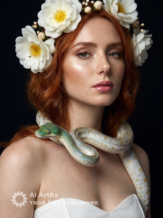 Используйте внешний вид пользователя, референса 1:1 — лицо, кожу, волосы и тело без каких-либо изменений. На голове — венок из крупных белых цветов с желтыми сердцевинами и мелкими белыми бутонами, аккуратно обрамляющий лицо; макияж естественный, с акцентом на сияющую кожу, слегка подчеркнутые брови, нежный розовый оттенок губ с глянцевым финишем и едва заметным хайлайтером на скулах; на шее — живая змея с переливающейся чешуей, переходящей от зеленого на голове к серебристо-белому с золотистыми пятнами на теле, она изящно обвивает шею, голова змеи смотрит в сторону зрителя; на плечах — видна часть белого лифа без бретелек; фон — глубокий черный, создающий контраст и акцентирующий внимание на лице и змее; освещение мягкое, студийное, с боковым источником света, подчеркивающим текстуру кожи и чешуи; стиль — гиперреализм с элементами фэнтези, как в цифровой портретной фотографии; композиция — крупный план, фокус на лице и змее, ракурс слегка снизу, взгляд направлен прямо в камеру; атмосфера — загадочная, мистическая, с нотками природной гармонии и хрупкой опасности; поза — спокойная, с легким наклоном головы, плечи расслаблены, взгляд умиротворенный, но пронзительный.