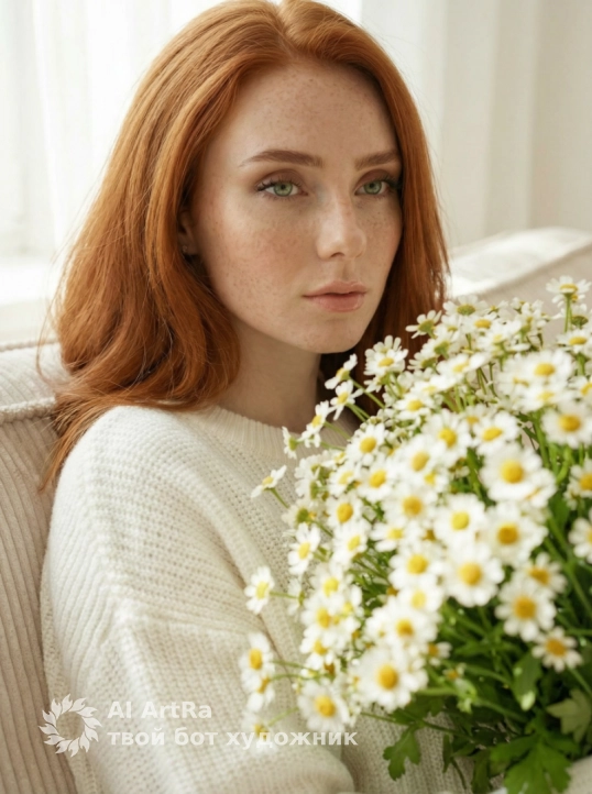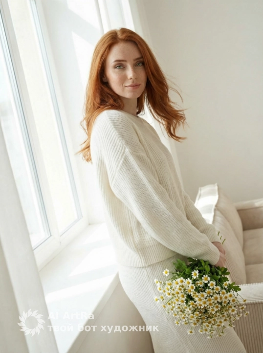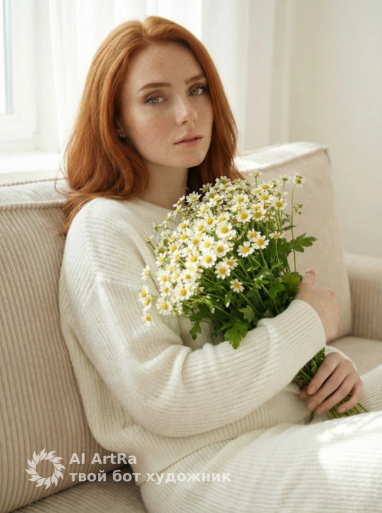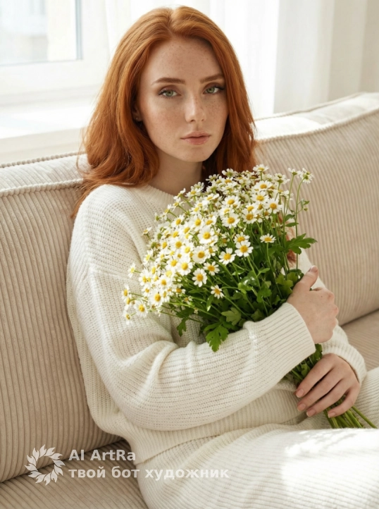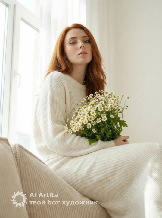 Используйте внешний вид пользователя, референса 1:1 — лицо, кожу, волосы и тело без каких-либо изменений. Женщина сидит на светлом вельветовом диване с вертикальной рельефной текстурой, держа в руках пышный букет белых ромашек с ярко-желтыми сердцевинами и зелеными стеблями, которые частично скрывают её туловище. Она одета в белый вязаный костюм из двух предметов — свободный свитер с широкими рукавами и брюки прямого кроя, оба с выраженной рельефной текстурой вязки. Макияж нежный и естественный: акцент на выразительных глазах с тонким слоем теней, подчеркнутыми ресницами и едва заметной подводкой, брови аккуратно оформлены, губы с легким блеском. Ногти короткие, ухоженные, без лака. На ней нет украшений. Съемка выполнена в стиле высокого реализма с мягким студийным освещением, создающим четкие, но не резкие тени от солнечных лучей, падающих слева — это придает сцене уютное, спокойное и немного мечтательное настроение. Камера расположена на уровне глаз, ракурс — полупрофиль, композиция смещена влево, оставляя пространство для света и теней справа. Кадр — средний план, фокус на лице и букете, фон — нейтральная светлая стена без деталей. Атмосфера — умиротворенная, чистая, элегантная, с нотками нежности и природной свежести.
