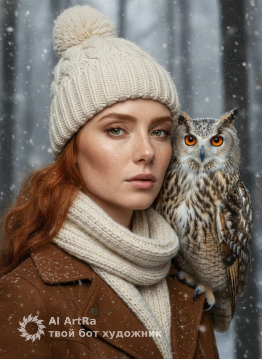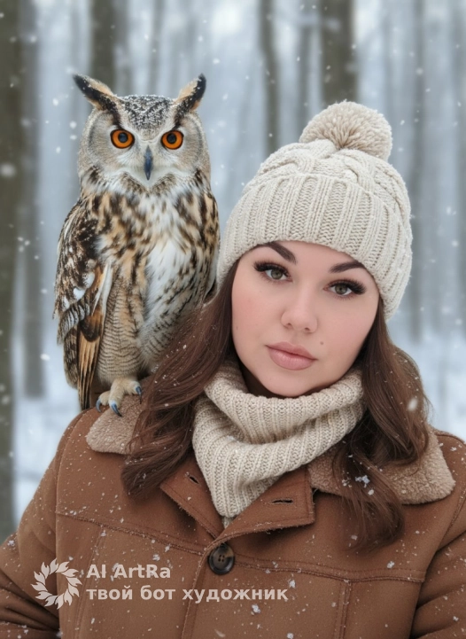 Используйте внешний вид пользователя, референса 1:1 — лицо, кожу, волосы и тело без каких-либо изменений. На плече у неё сидит крупная сова с выразительными оранжевыми глазами, чётко прорисованным оперением в бело-коричневых тонах с тёмными пятнами, синим клювом и лапками, слегка пыльными от снега; на голове — объёмная вязаная шапка кремового цвета с помпоном, на шее — плотный вязаный шарф в тон шапке, на теле — коричневая замшевая куртка с воротником и пуговицей, слегка покрытая снежинками; макияж нежный, с акцентом на естественном румянце и блеске губ, ногти не видны, украшений нет; сцена происходит в зимнем лесу с размытыми стволами деревьев на фоне, падающим снегом и мягким рассеянным светом, создающим атмосферу спокойной магии; стиль — гиперреализм с детализацией текстур ткани, перьев и снега; ракурс — средний план, камера на уровне глаз, объекты расположены центрально, с лёгким смещением совы вправо; композиция симметричная, с глубоким размытием фона, акцентирующим внимание на взгляде и взаимодействии; настроение — тихое, волшебное, умиротворённое, с ноткой загадочности.