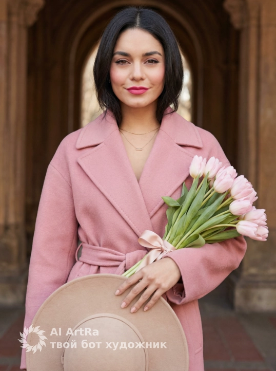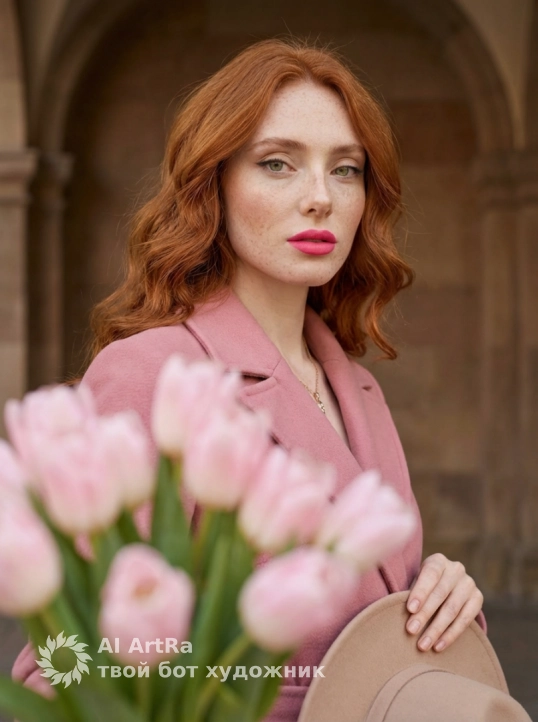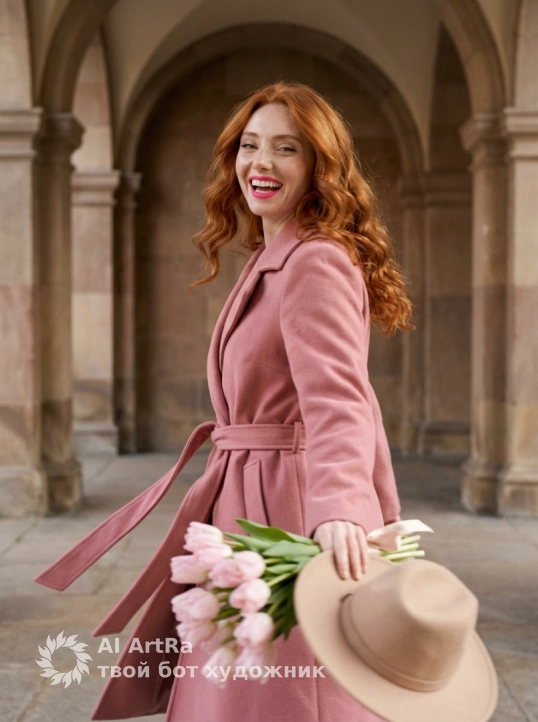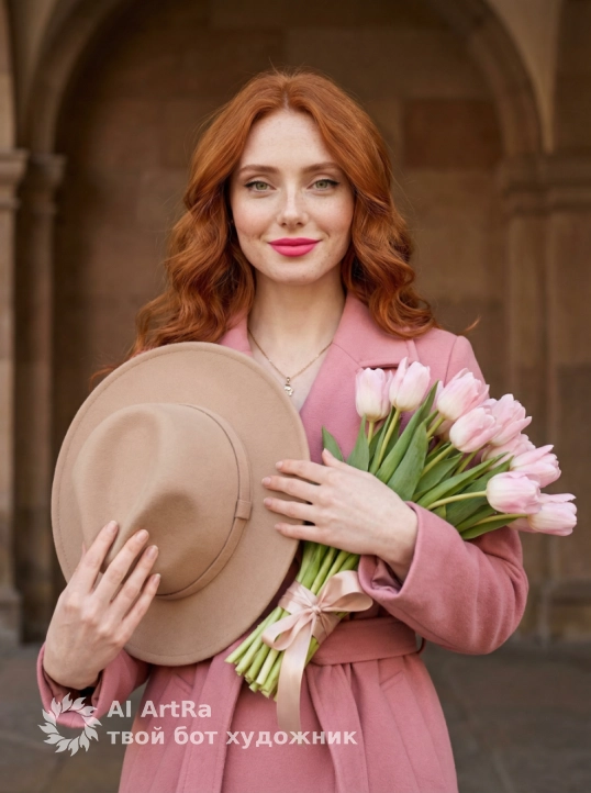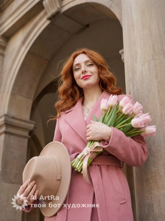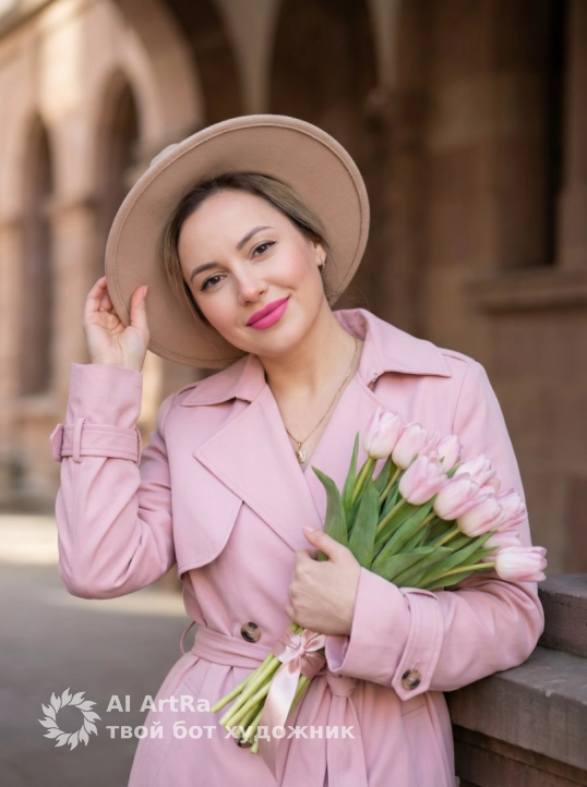 Используйте внешний вид пользователя, референса 1:1 — лицо, кожу, волосы и тело без каких-либо изменений. На лице — утончённый макияж с ярко-розовой матовой помадой, акцентом на глазах с тонким чёрным карандашом и лёгким румянцем на скулах; ногти короткие, аккуратно ухоженные, без лака; на шее — тонкая золотистая цепочка с минималистичным подвесом. Главный объект — женщина в элегантном розовом пальто с поясом, держащая в руках букет нежно-розовых тюльпанов, перевязанных атласной лентой; поза — лёгкий наклон вперёд, одна рука придерживает широкополую бежевую шляпу, другая обнимает цветы, взгляд направлен в камеру с тёплой улыбкой. Стиль — высококачественная фотосъёмка с мягким боке, реалистичная текстура ткани и лепестков. Фон — архитектурные элементы из тёплого коричневого камня, геометричные выступы создают глубину. Освещение — дневное, рассеянное, с мягкими тенями, цветовая палитра — пастельные розовые и бежевые тона с акцентами зелени листьев. Камера — фронтальный ракурс, средний план, объект расположен по центру, слегка смещён вправо, композиция симметрична с визуальным балансом между фигурой и архитектурой. Атмосфера — романтичная, весенняя, нежная, с ощущением утончённого шарма и спокойной радости.