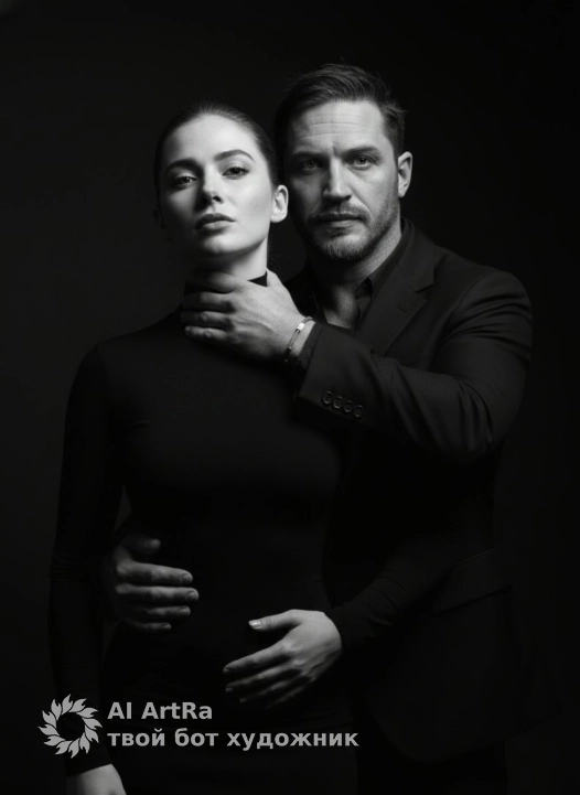 The setting is a dark studio with a seamless black background. The surrounding space is almost completely immersed in shadow. The lighting is contrasting, dramatic cinematic lighting, one hard, directional light source is positioned to the right of the camera and slightly above head level. Strong side-top lighting creates brightly illuminated areas on the woman's hair, the man's hand, and his jacket. The rest of the space and body parts are in deep shadow. The shadows are hard contrasts with sharp edges, dark areas are almost completely lacking in detail, creating a pronounced low-key effect. The overall tone of the image is black and white, without color, with deep blacks and clear highlights. Highly detailed, photorealistic, shot on an 85mm portrait lens. Faces are not altered.