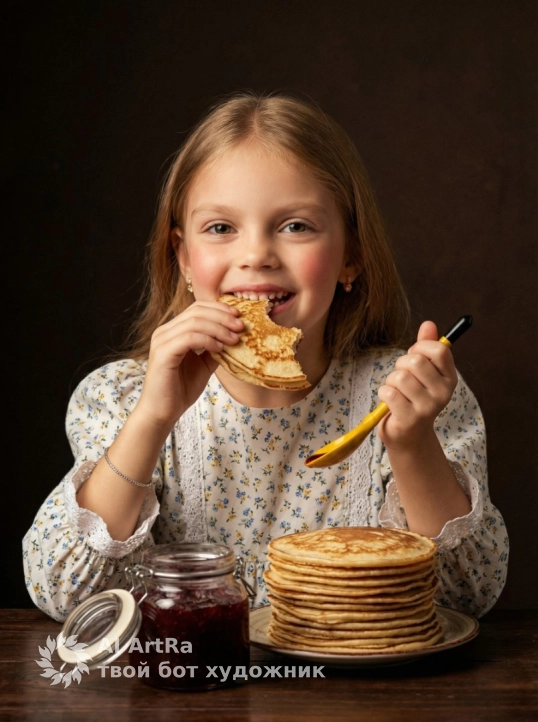Используйте внешний вид пользователя, референса 1:1 — лицо, кожу, волосы и тело без каких-либо изменений, с акцентом на естественный, свежий макияж: легкий румянец на щеках, едва заметный блеск на губах, чистые брови без подводки, без теней и туши; маникюр и педикюр не видны, но предполагается натуральный, ухоженный вид ногтей без лака; украшения — маленькие золотистые серьги-гвоздики и тонкий серебристый браслет на левом запястье; главный объект — девочка, сидящая за темным деревянным столом, счастливо улыбающаяся и кусающая блин, в правой руке держит желтую ложку с черной ручкой, рядом — стеклянная банка с темно-красным вареньем и тарелка с высокой стопкой блинов; художественный стиль — высококачественная студийная фотография с мягким боке, реалистичная детализация ткани, текстуры кожи и еды; фон — глубокий темно-коричневый, слегка зернистый, без рисунка, создающий уютную, теплую атмосферу; освещение — мягкое, боковое, слева, подчеркивающее объем лица и блики на блинах и варенье, теплые золотисто-медовые тона, настроение — радостное, ностальгическое, домашнее; камера — фронтальный ракурс, чуть снизу, композиция — средний план, с акцентом на лицо и руки, объект расположен центрально, с небольшим смещением вправо; масштаб — средний план, от груди вверх, с включением стола и еды; атмосфера — искренняя детская радость, уют, ностальгия по простым радостям; одежда — платье с мелким цветочным принтом в синих и желтых тонах на белом фоне, с пышными рукавами, кружевной отделкой по манжетам и поясом из синей ткани; поза — сидя, слегка наклонившись вперед, левая рука подносит блин ко рту, правая — держит ложку, взгляд обращен прямо в камеру с игривой улыбкой.