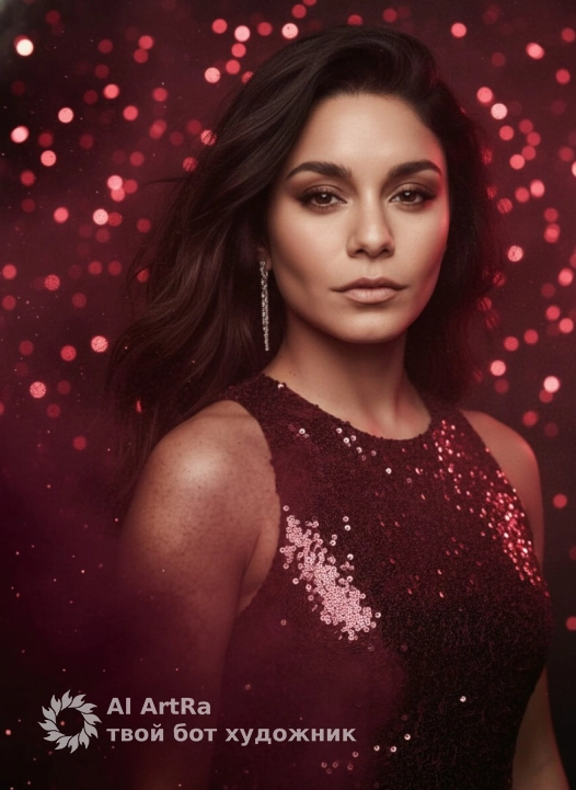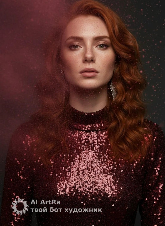 Фотореалистичный студийный портрет: тёмный фон с рассеянными красно-розовыми боке, густое бардово-розовое облако пудры/дыма расходится по кадру перед моделью с левой части кадра, мерцающее платье из мелких пайеток бордового цвета до линии шеи, волнистые волосы с мягким боковым и римлайтом, видимо ухо с изящной серебряной подвесной серёжкой; акцент на текстуре пайеток и взвешенных частицах в воздухе, насыщенные контрастные тона, кинематографическое освещение, малая глубина резкости, резкость на волосах/серёжке/пайетках, мягкое боке на заднем плане, сверхдетализированно, 85mm, f/1.8, 4K, художественная цветокоррекция (бардовые и тёплые оттенки), лёгкая плёночная зернистость, драматическая, гламурная атмосфера. Use the user's appearance 1:1 — face, skin, hair and body without any changes.