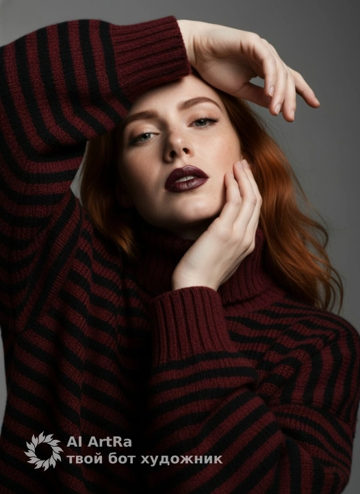 Используйте внешний вид пользователя, референса 1:1 — лицо, кожу, волосы и тело без каких-либо изменений. Крупный план женщины в динамичной позе: одна рука прижата к лбу, пальцы слегка изогнуты, вторая рука обхватывает подбородок, создавая асимметричную композицию с акцентом на контраст между плавными линиями кожи и четкими складками объемной водолазки с черно-бордовым полосатым узором. Стиль — высокодетализированная студийная фотография с кинематографическим освещением: мягкий боке на однотонном сером фоне, глубокие тени подчеркивают рельеф лица и текстуру ткани, губы выделены насыщенным бордовым матовым помадным покрытием с едва заметным металлическим отливом. Камера снятая с низкого ракурса, создавая впечатление силы и элегантности, фокус на точном положении пальцев, естественном изгибе запястий и игре света на гладкой поверхности кожи, передавая настроение смелой уверенности и художественной выразительности.