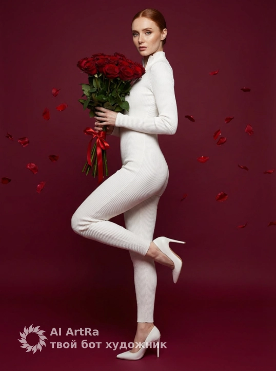 Снимок выполнен в гламурном, романтическом стиле. Контраст белого комбинезона и красных роз с тёмным фоном создаёт эффектный визуальный акцент. Образ выглядит элегантным, чувственным и эстетически выверенным. сохрани черты лица