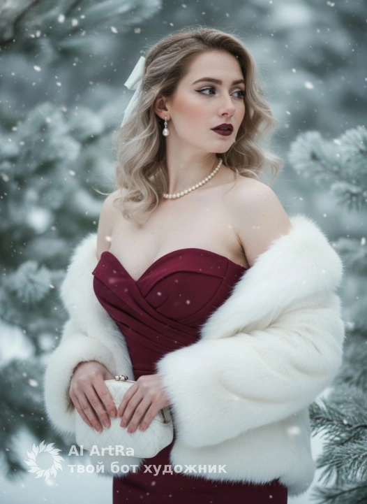 Не меняя внешности женщины с фото, в зимнем пейзаже с заснеженными еловыми ветвями на фоне, она предстает как воплощение элегантной роскоши. Ее тело повернуто в три четверти, взгляд устремлен в сторону, создавая ощущение ускользающей мечтательности и загадочности. Взъерошенные волны светло-русых волос мягко спадают на плечи, украшенные белым бантом, добавляющим тонкую нотку изысканности. На ее плечах уютно задрапирована пушистая белая шубка из меха с богатой текстурой, которая контрастирует с гладкой, плотно облегающей фигурное облегание отделкой бордового платья без бретелей, подчеркивающего линию декольте с тщательно сложенной тканью в центре. В руках она держит элегантный белый клатч с чётко выделенной стёжкой, его фактура придаёт дополнительный оттенок утонченности. Свет на лице и теле мягко падает слева, вырисовывая деликатные тени, которые подчеркивают скулы и плавность очертаний рук. Визаж акцентирован темной помадой и графичным подтоном металлической стрелки на веках, придающих образу драматическую выразительность. Жемчужное ожерелье и серьги с подвесками из жемчуга добавляют классический штрих, подчеркивающий ее безупречный стиль. Вся композиция пронизана атмосферой зимней сказки, где холодный воздух и мягкий снег встречаются с теплом и роскошью, создавая захватывающий контраст. Холодные оттенки зеленых и белых еловых ветвей в сочетании с насыщенными тонами наряда и теплым светом делают это изображение кинематографичным и волшебным, словно кадр из зимней мелодрамы, фотореалистичное изображение, высокая текстурная детализация, высокое качество, разрешение 4K.