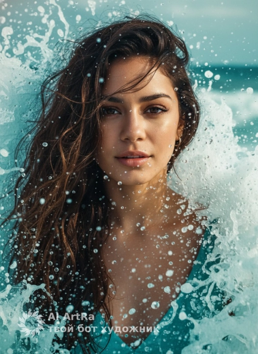 Close-up cinematic portrait of a woman near crashing waves, droplets suspended in the air like crystals. Wet skin glow, soft natural sunlight, dramatic ocean wind. Aqua tones reflected in her gown and the background water. Ultra-sharp detailing of eyelashes, skin texture, and water droplets. 8K hyperrealistic face shot.