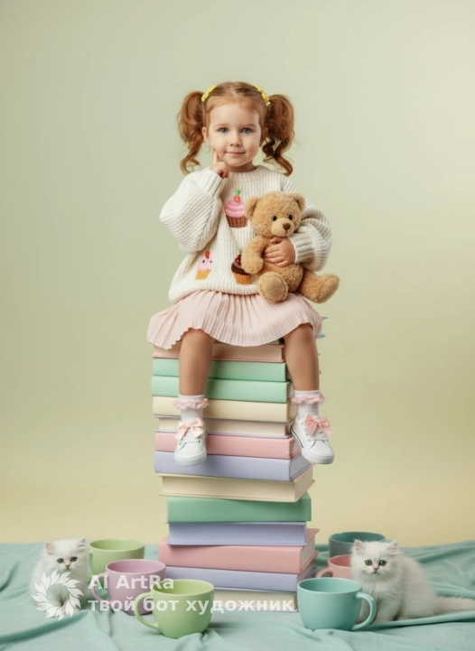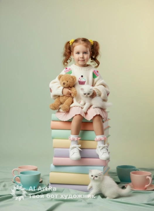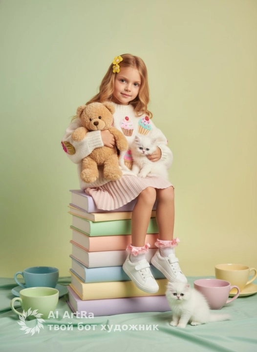Full length shot of a young girl sitting on a tall stack of untitled, pastel colored, deocratic large books, she is holding a light brown teddy bear, with her other hand she is petting a kitten, she is wearing an oversized milky knit sweater with cupcake and ice cream appliqués, a light pink pleated skirt, white sneakers and white socks with pink ruffles and bows, she has yellow flower barrettes in her hair, the girl is surrounded by props that include large pastel teacups and two white fluffy Persian kittens, one kitten is sitting on the floor, the second kitten is sitting on the girl's lap, the background is a studio set with a soft gradient background from soft green to yellow and the floor is covered with mint soft fabric, soft diffused studio lighting, frontal fill light, minimal soft shadows, photorealistic, highly detailed.