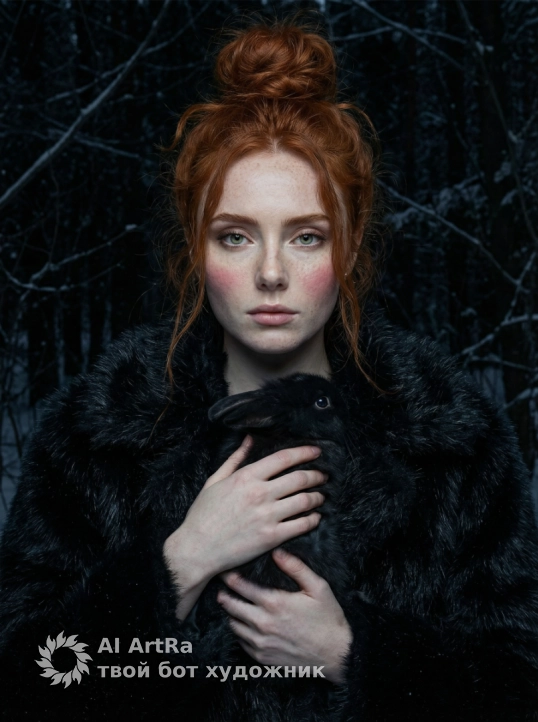 СТРОГО СОХРАНИ ВНЕШНОСТЬ девушки с прикреплённого фото, 1:1. НЕ изменять лицо, пропорции, мимику, кожу. НЕ изменять цвет, длину и текстуру волос. Загруженное фото — ЕДИНСТВЕННЫЙ эталон внешности. Гиперреалистичное портретное фото, средний план. Девушка стоит фронтально. В руках черный кролик, прижат к корпусу. Пальцы сомкнуты спокойно, без напряжения. Корпус ровный, без разворота. Голова прямо. Взгляд в камеру. Выражение спокойное, отстранённое. Образ: черная пушистая шуба с длинным ворсом. Неаккуратный высокий пучок, некоторые пряди выпадают. Холодный румянец на щеках. Фон: черный зимний лес, ветви в черноте. Свет мягкий, холодный, рассеянный. Фотореализм, высокая детализация меха, кожи и шерсти кролика.