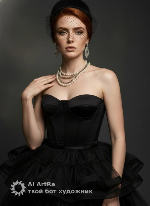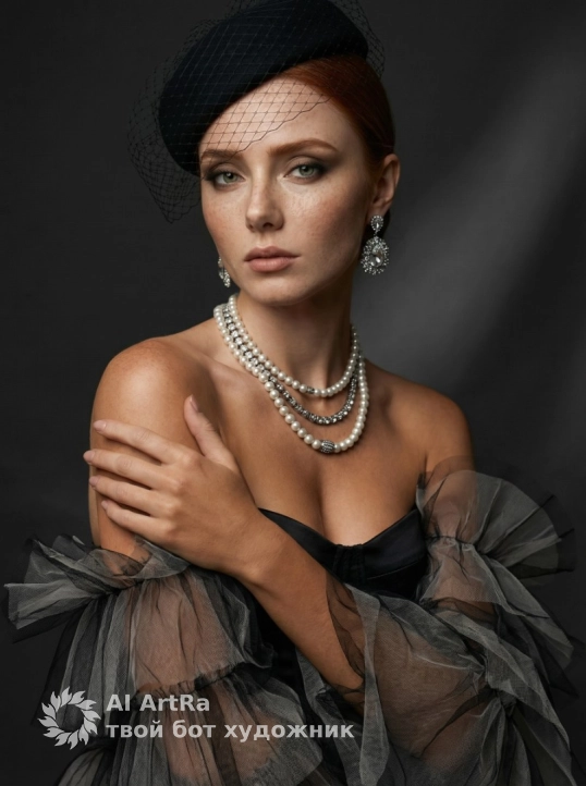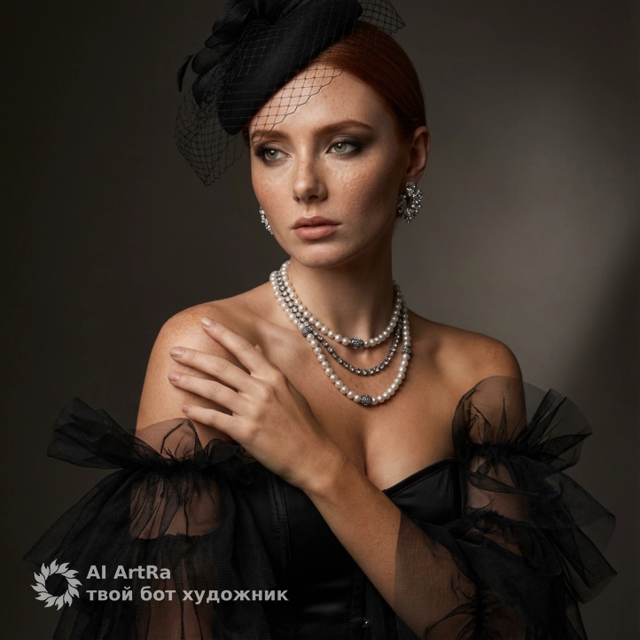 Не меняя внешности женщины с фото, элегантная фигура в роскошном платье с корсетом из гладкого черного материала, переходящем в пышные многослойные оборки из полупрозрачной черной сетчатой ткани. Женщина фронтально к зрителю, правая рука прижата к левому плечу, подчеркивая декольте и загорелую кожу. На голове стильная черная шляпка с сеточкой на гладко уложенных волосах. Лицо освещено сбоку, с выразительными чертами: дымчатый макияж глаз, точно очерченные брови, матовые губы с серьезным, задумчивым выражением, без изменения лица. Жемчужные многослойные ожерелья с металлическими элементами на ключицах и крупные блестящие серьги добавляют изысканности. Фон нейтрально темный с мягкой градацией и игрой света и тени, создающей бархатистость и камерность, в стиле модного портрета. Композиция симметрична в квадратных границах кадра, высокая текстурная детализация, фотореалистичное 8K изображение, высокая четкость.