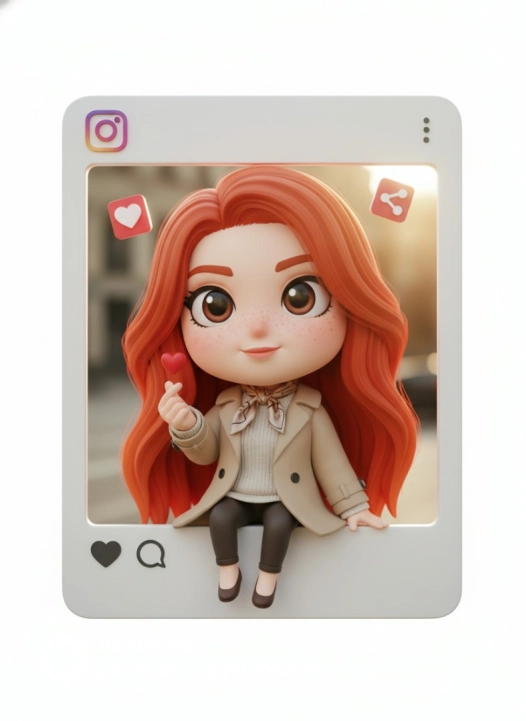 Создайте стилизованного 3D-персонажа в стиле чиби на основе прилагаемой фотографии, точно передав черты лица и детали одежды. Левая рука персонажа образует форму сердца (с красным сердечком над пальцем) и игриво сидит на краю большой фоторамки Instagram, свесив ноги наружу. Вокруг неё парят значки социальных сетей (лайк, комментарий и репост).