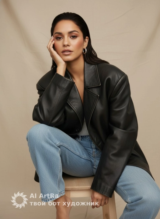 Studio fashion portrait, clean neutral beige background, soft seamless backdrop. Woman seated on a simple wooden stool, relaxed but confident pose, knees bent and slightly apart, leaning forward. One hand resting casually on the side of her face, elbow supported, other hand relaxed between legs.