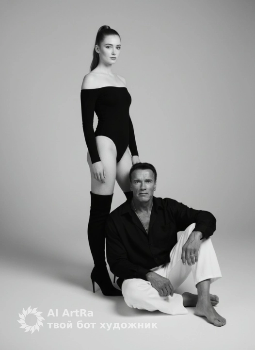 This prompt must be applied to the people in the photo. Important: Do not change or distort faces. Do not alter facial expressions. Faces must be preserved completely, as in the original photos. Use the facial features and likeness from the provided reference images. Generate the scene around them, but keep their faces identical. Prompt: A black-and-white studio photo of a couple. The man sits barefoot on a cyclorama, directly toward the camera. The woman looks into the camera. The woman stands close to the man; the man has his head pressed against the woman's leg and is touching the woman's leg with his hand. Full-length portrait, angled at eye level. The woman has her hair pulled back into a high ponytail, wearing a black off-the-shoulder bodysuit and black over-the-knee boots with high heels. The man is wearing an oversized black unbuttoned shirt and white cotton wide-leg pants, with a silver chain around his neck. Indoors, a professional photo studio on a simple, light-gray cyclorama. Soft yet directional studio lighting creates crisp highlights and soft shadows. Shot with a 50mm lens, the depth of field is moderate, creating a photorealistic look.