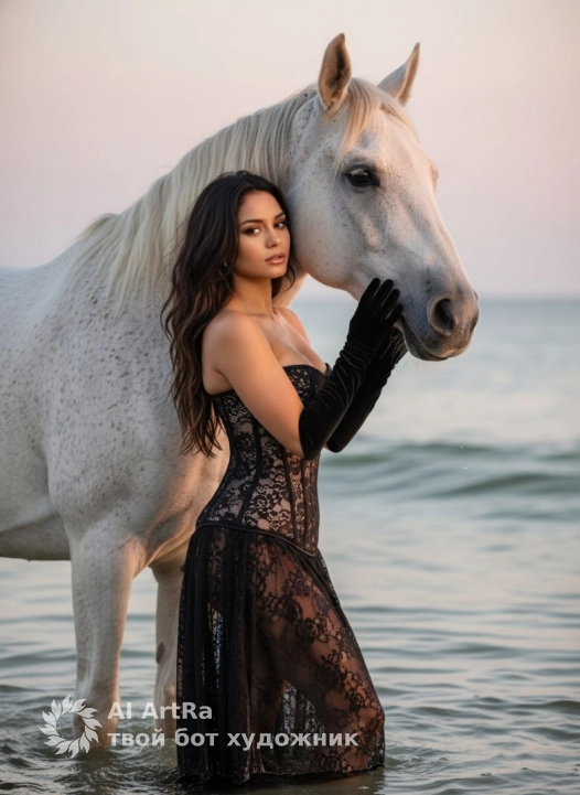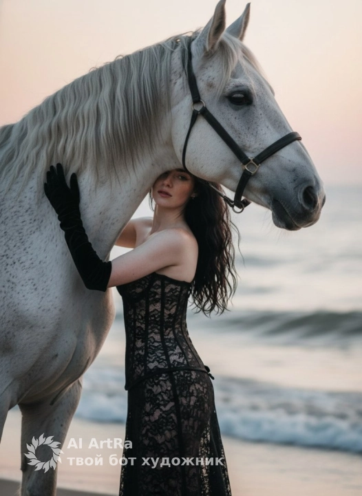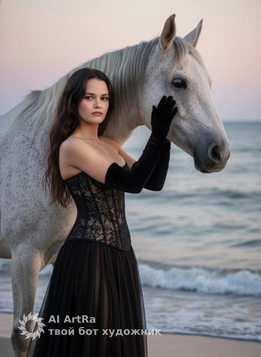 Не меняя внешности женщины с фото, она стоит у берега моря на фоне спокойных волн и мягкого вечернего неба, окрашенного в нежные пастельные оттенки розового и серого. Женщина вплотную прижалась к крупному белому коню с благородной, слегка пегой шерстью, чья голова обращена в профиль направо, глаза отражают спокойствие и глубину. Женщина вытянула руки, обнажённые до плеч в бархатных чёрных перчатках, и обе ладони покоятся на холке и лице лошади, словно держа невидимую связь. Ее поза выразительна и грациозна, с лёгким изгибом тела, что подчёркивает стройность и элегантность. Она облачена в чёрное кружевное платье корсетного фасона, плотно облегающее торс и плавно переходящее в ниспадающую сетку. Текстура кружева контрастирует с гладкой, ледяной шерстью животного, создавая игру теней и света, которые подчёркивают сложную структуру одежды и нежность кожи. Черные волнистые волосы женщины свободно спадают на плечи и спину, обрамляя лицо с выразительными чертами и спокойным уверенным выражением. Свет заката мягко освещает всю сцену, придавая ей загадочный и романтичный тон, а тонкие блики рождаются на металлических элементах узды на лошади. Композиция кадра строится так, что взгляд плавно переходит от женщины к коню и далее к бескрайнему морю, создавая атмосферу умиротворённого диалога между человеком, животным и природой, фотореалистичное изображение, высокая текстурная детализация, высокое качество, разрешение 4K. Портретная съемка . Девушка по пояс .
