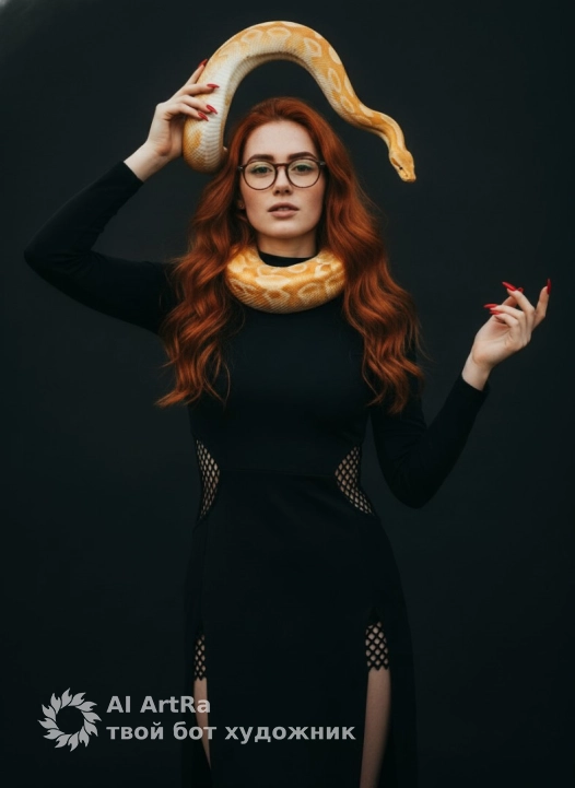 Не меняя внешности женщины с фото, перед нами встает образ сильной и загадочной фигуры, словно воплощение смелости и изящества в одном кадре. Светлый золотисто-рыжий питон грациозно обвивает её шею и взмывает вверх, изгибаясь над головой, словно живой элемент её образа, подчеркивая плавность линий фигуры и движения. Женщина стоит прямо, взгляд её сфокусирован вперёд, безупречно сохранены черты лица и индивидуальность, выражающая уверенность и лёгкую интригу. Волосы длиной ниже плеч, мягкие, в волнах, создают контраст с темным фоном и глубоким черным платьем, которое плотно облегает тело и раскрывает бедра через узкие перекрещивающиеся ремешки – они словно тонкая сетка, декорирующая боковые части наряда. В платье с высоким вырезом и длинными разрезами, материал которого кажется гладким и матовым, внимание приковывается к сочетанию дерзкости и утонченности. Оптика мягко подчеркивает текстуру кожи, отражения и тени подобраны так, что создают ощущение глубины и объемности, а темный монохромный фон фокусирует все внимание на живой и динамичной композиции. Рука справа свободно придерживает змеиное тело у головы, а левая слегка приподнята вверх, пальцы с длинными, ярко-красными ногтями аккуратно касаются змеи, добавляя хладнокровной элегантности. Весь кадр пронизан атмосферой интриги и таинственной связи человека с природой, где каждая деталь — от позы до текстур — отточена и насыщена смыслом, создавая впечатление живой сказочной сцены, наполненной силой и красотой, фотореалистичное изображение, высокая текстурная детализация, высокое качество, разрешение 4K.